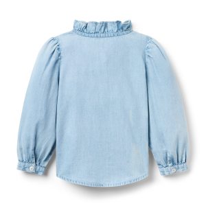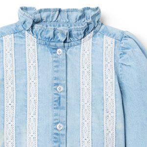 • Our chambray top gets a fashionable twist with lace details. A ruffle collar makes it even better.
