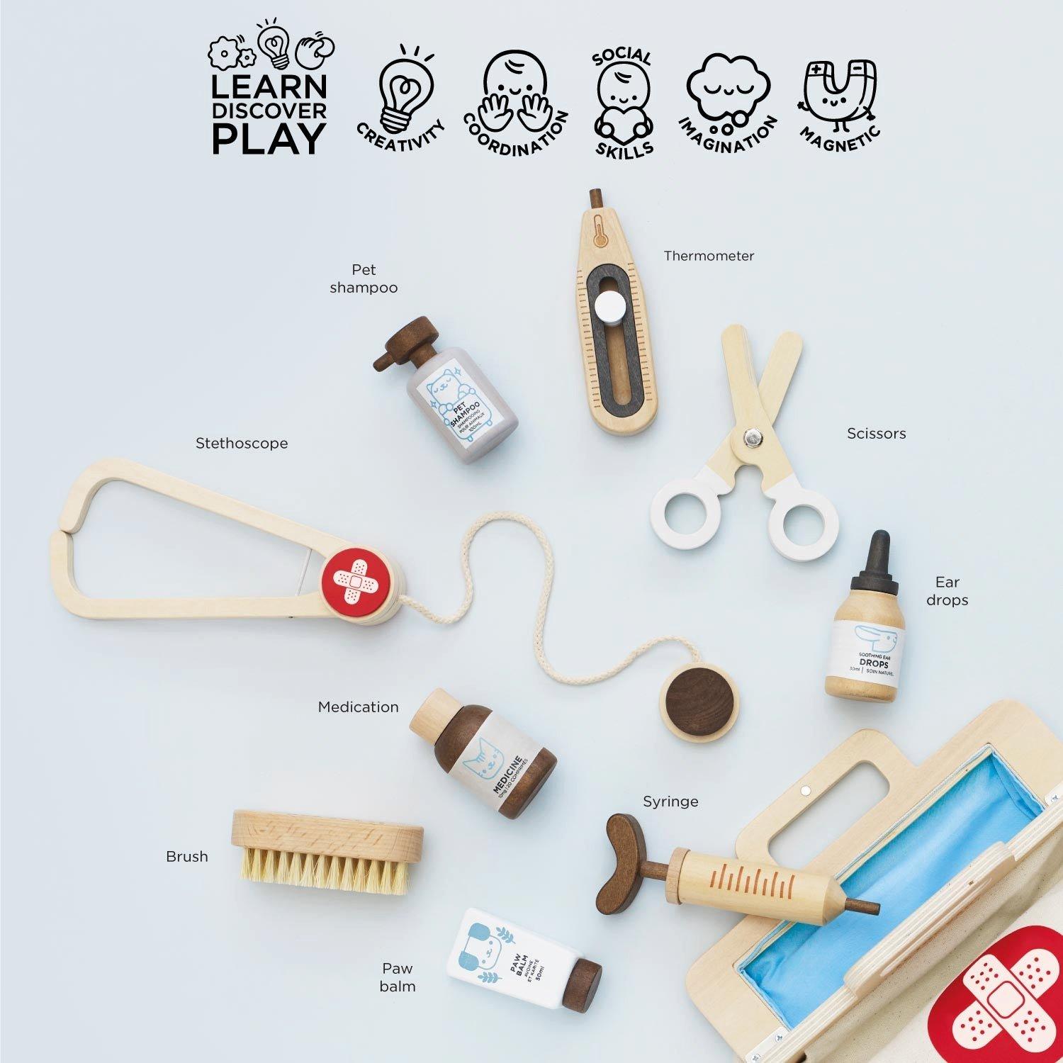 • Our Animal Care Set is the perfect companion for imaginary pet owners and animal lovers alike! This veterinarian-inspired set includes a vintage style storage medical aid bag, which is equipped with everything required to give any animal the best of care!