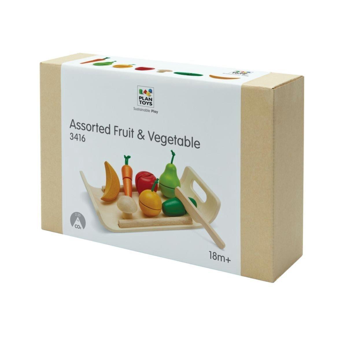The Assorted Fruits & Vegetables set includes an apple, a pear, an orange, a banana, a cucumber, a mushroom, a carrot, a knife, and a tray.
