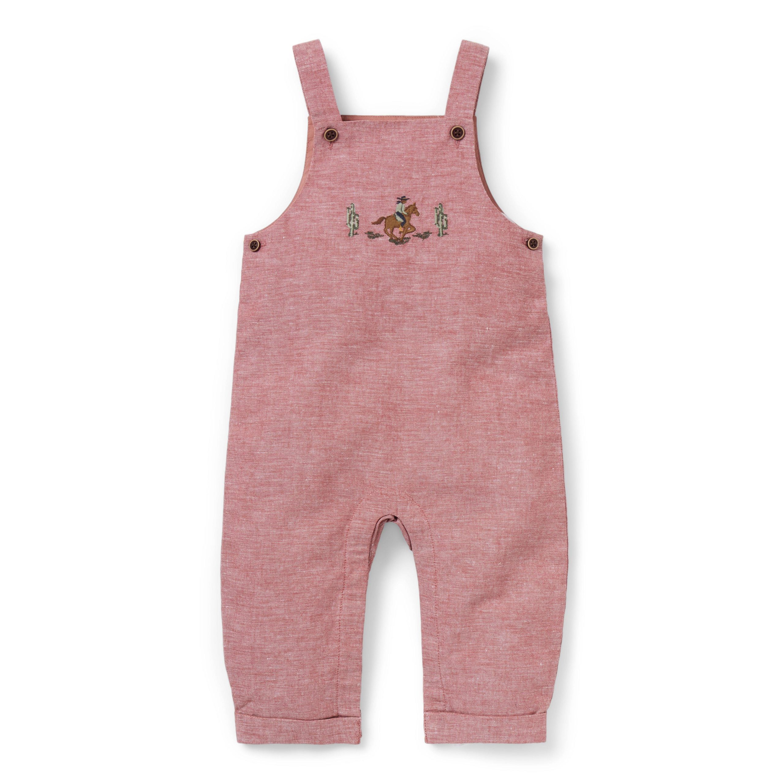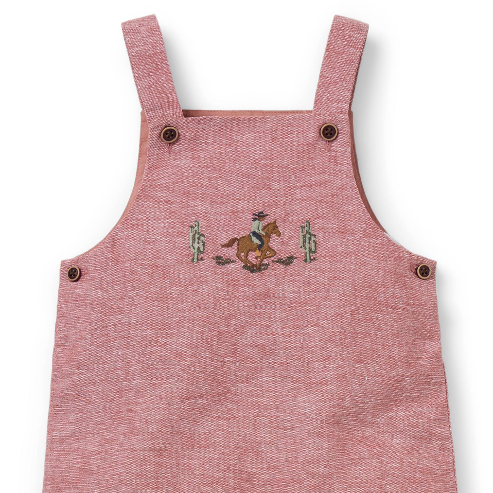 • A favorite for every first, our linen-cotton overall features an embroidered cowboy detail, plus a little back pocket too.
