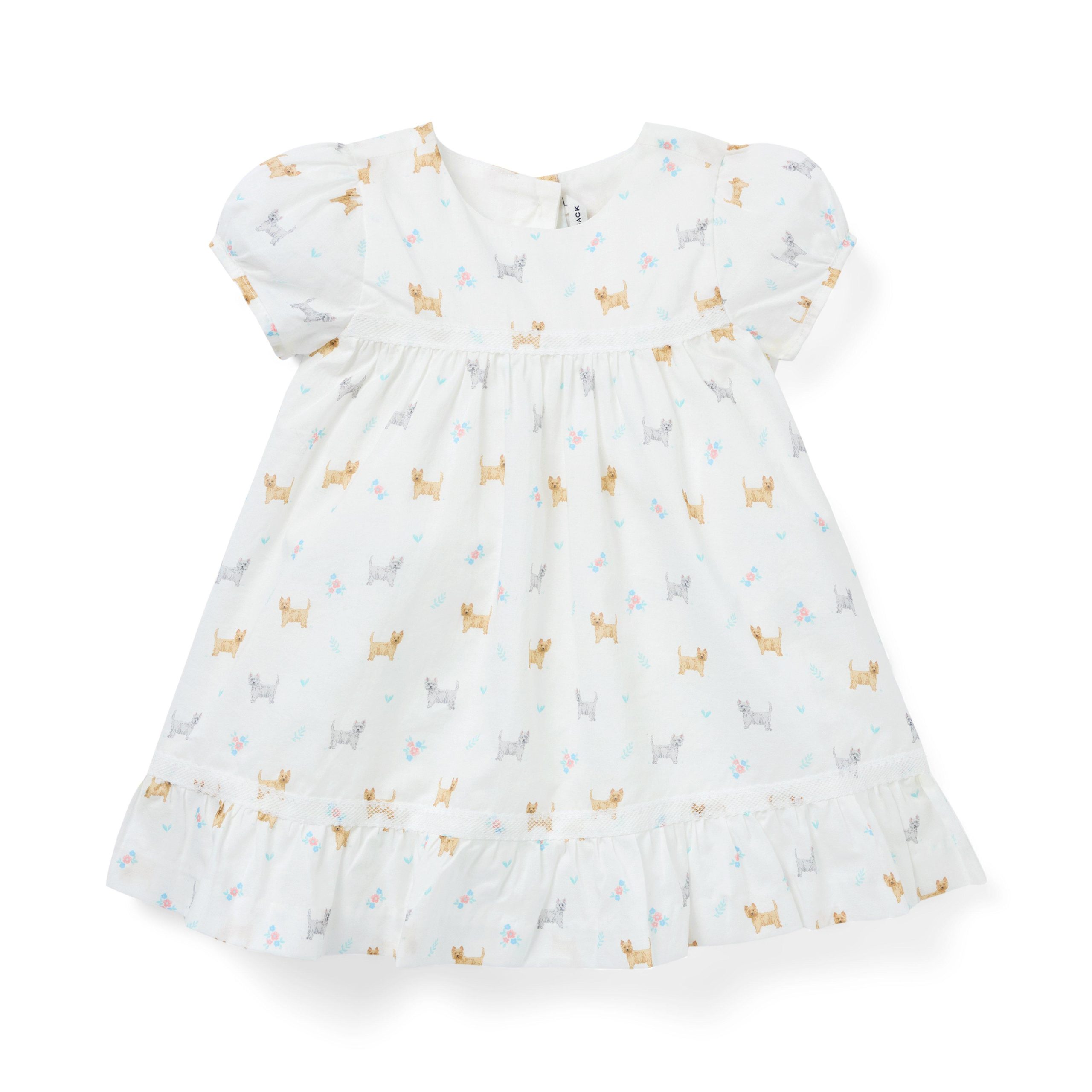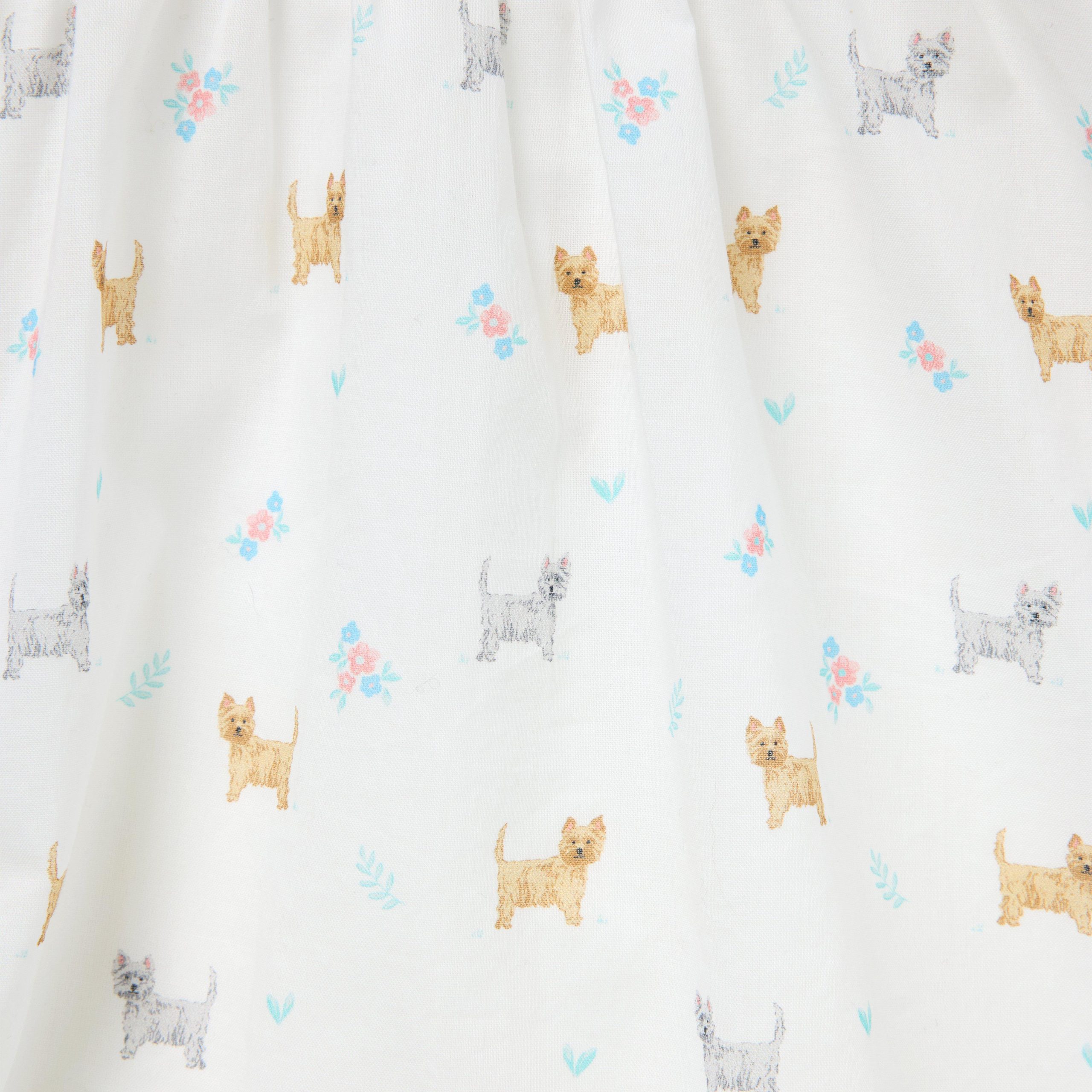 • We’re in puppy love with this pure cotton dress. With allover dog friends, puff sleeves and lace trim, it’s perfect for first special occasions or just because.
