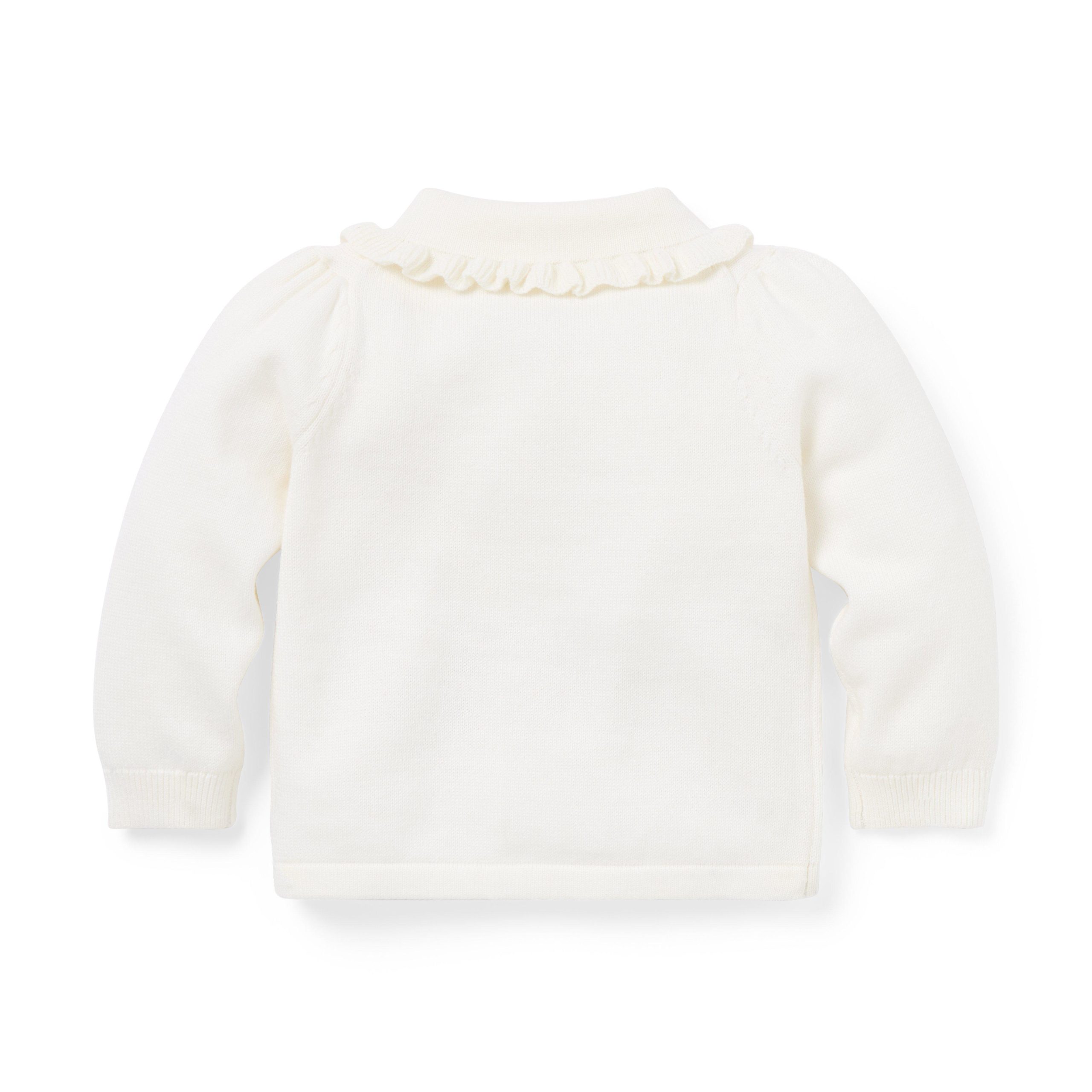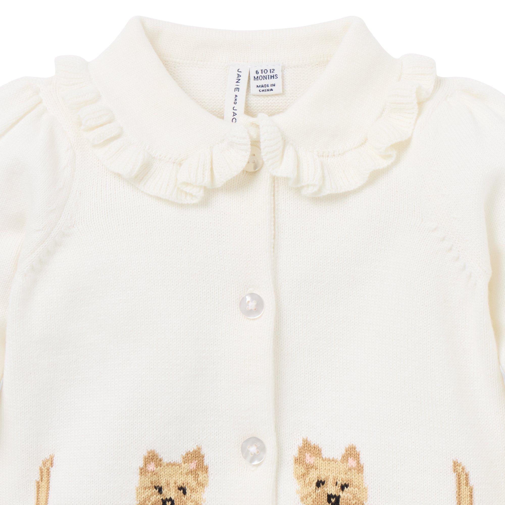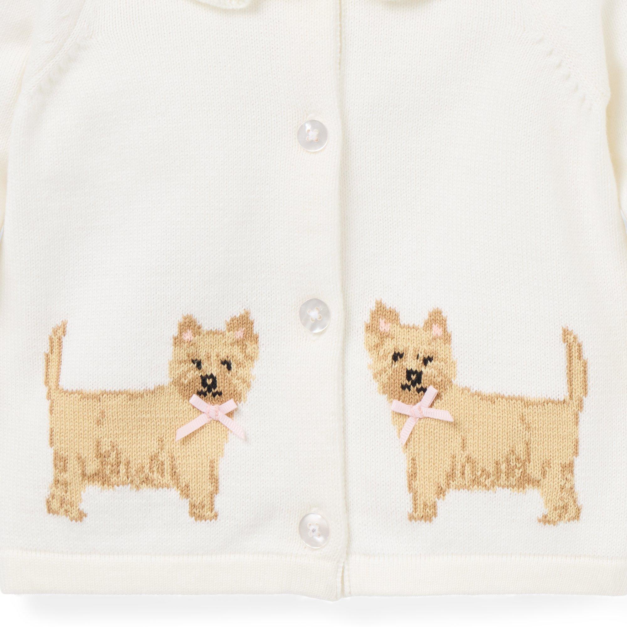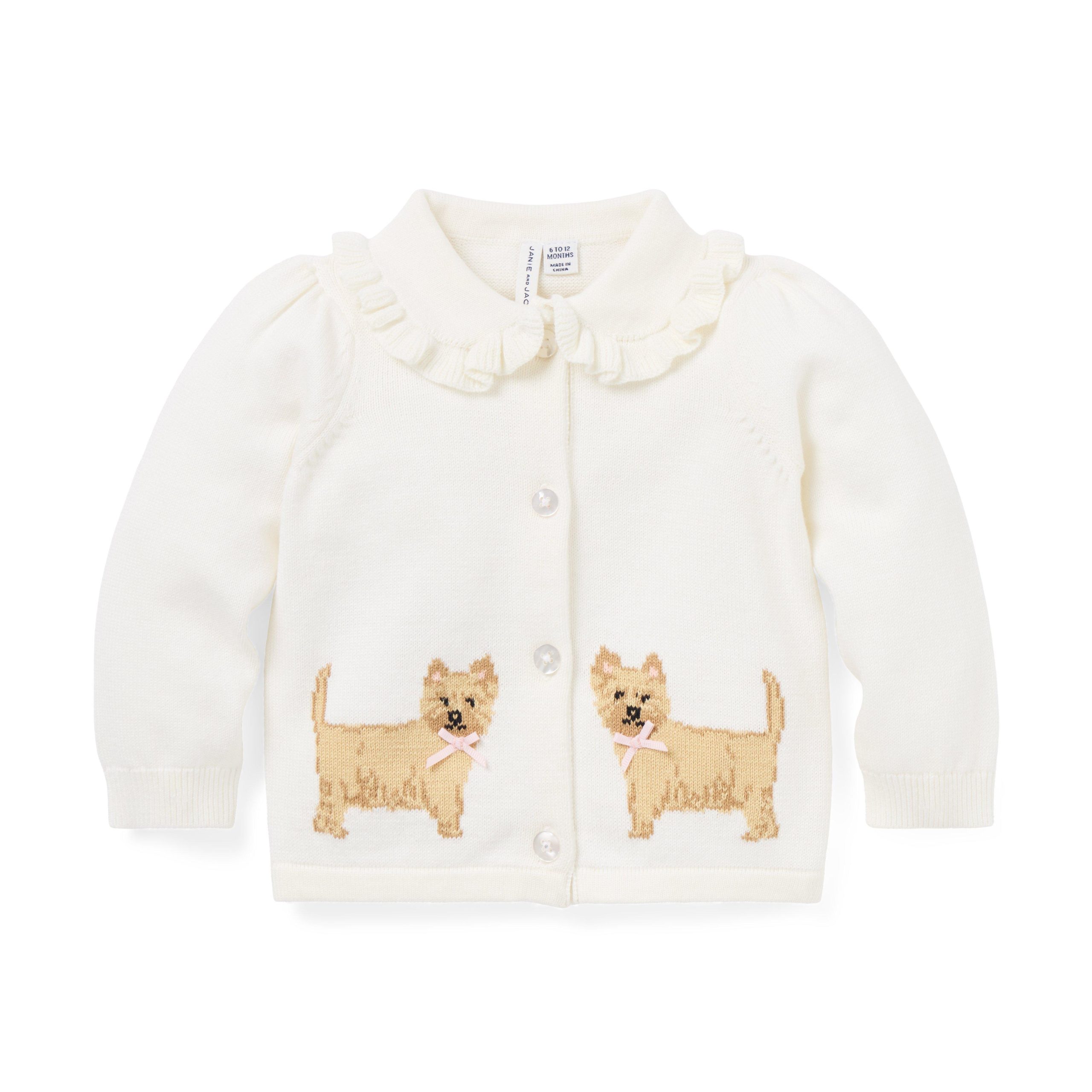 • Consider it puppy love. Our cardigan is designed with intarsia-knit dogs, a ruffle trimmed collar and little bow details too.