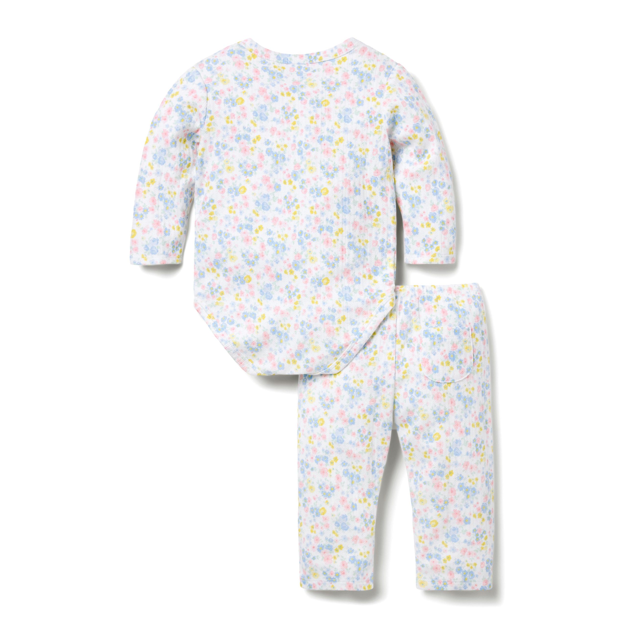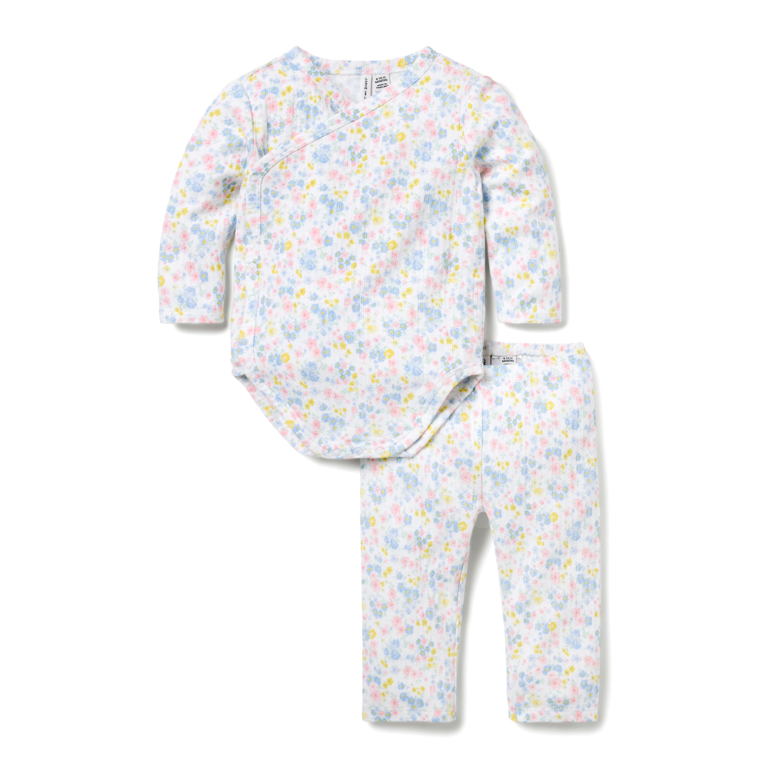 • Welcome baby in our soft floral print set. In a cozy pointelle knit, featuring a kimono-inspired wrap bodysuit and a pull-on pant with a little back pocket, just because.