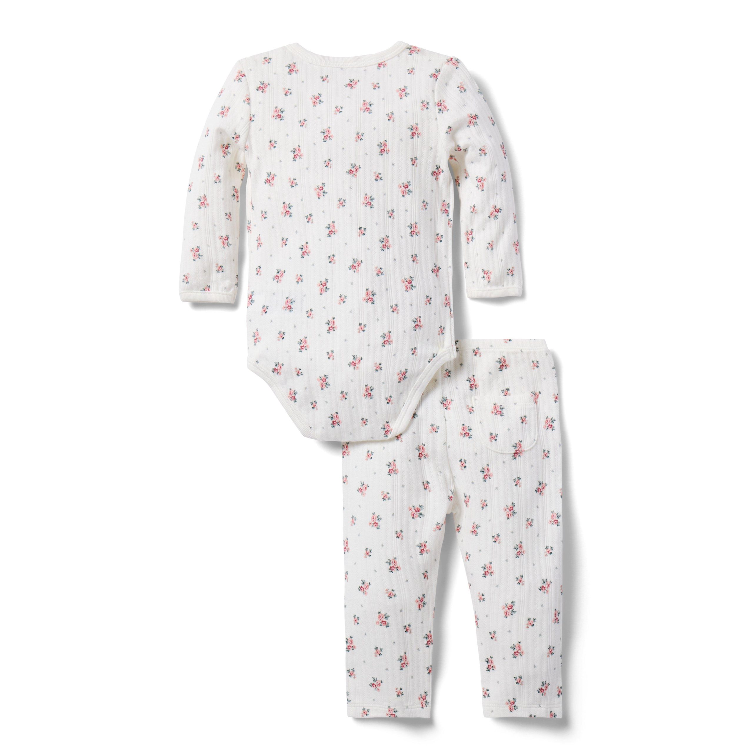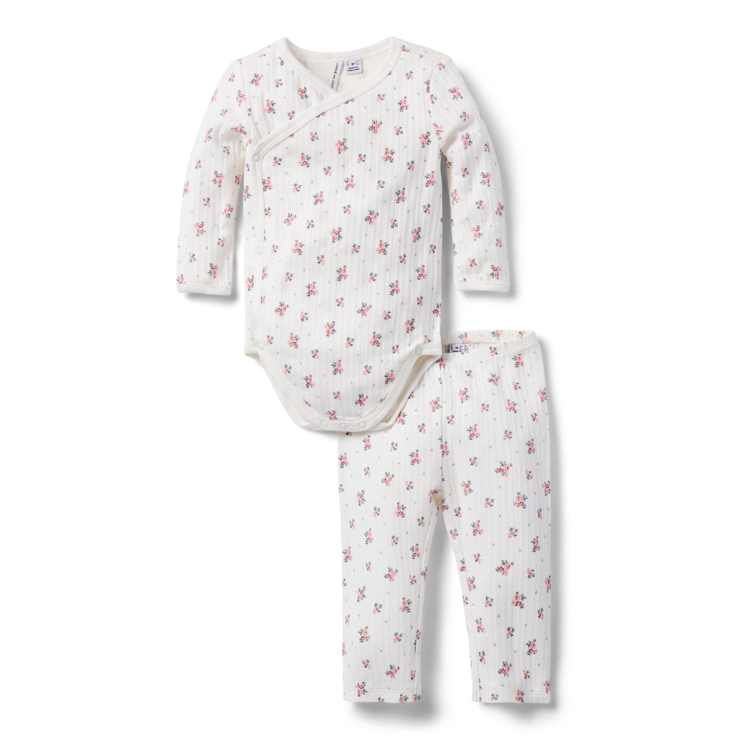 • Welcome baby in our soft floral print set. In a cozy pointelle rib knit, featuring a kimono-inspired wrap bodysuit and a pull-on pant with a little back pocket, just because.