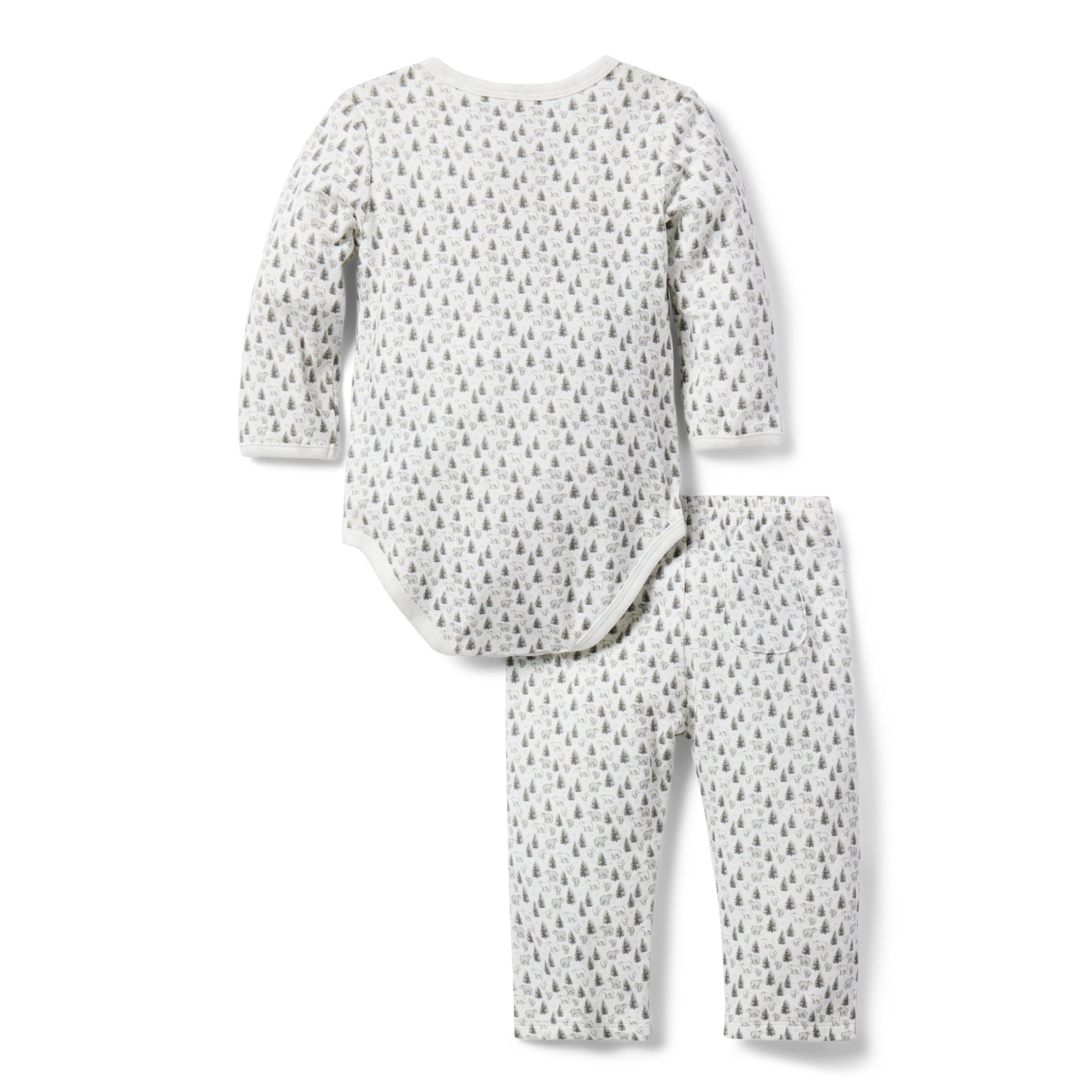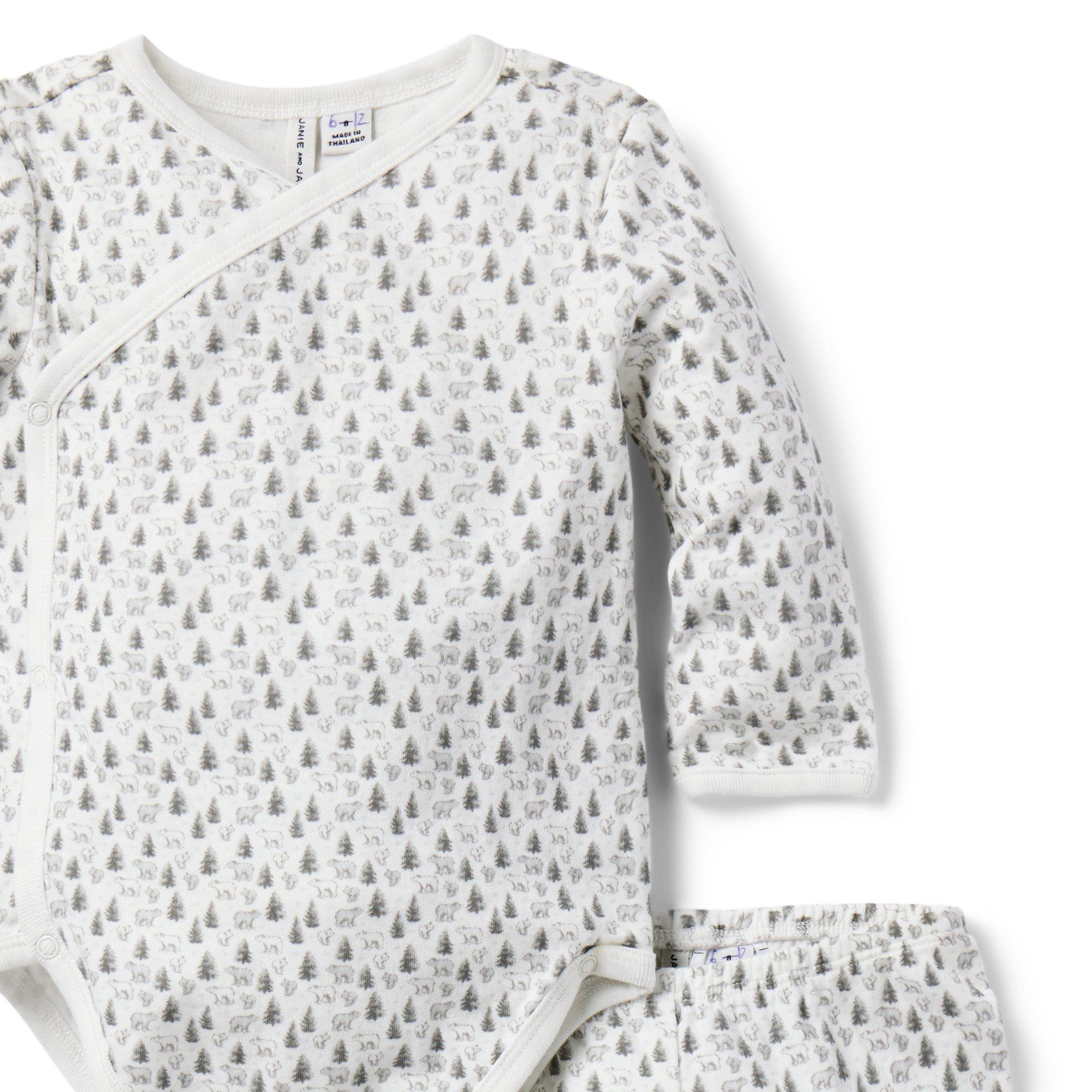 • Welcome baby in our bear and tree print matching set. Featuring a kimono-inspired wrap bodysuit and a pull-on pant with a little back pocket, just because.