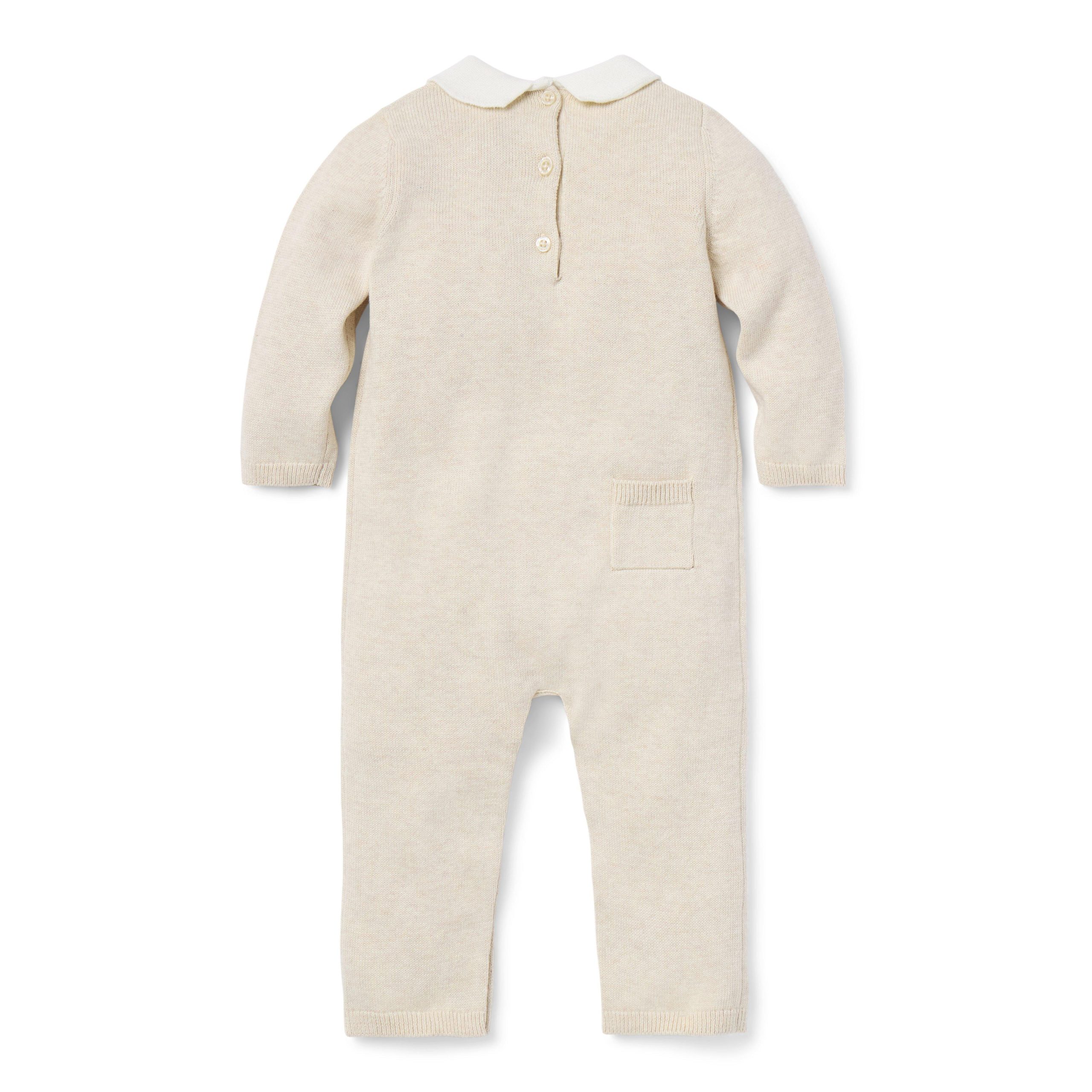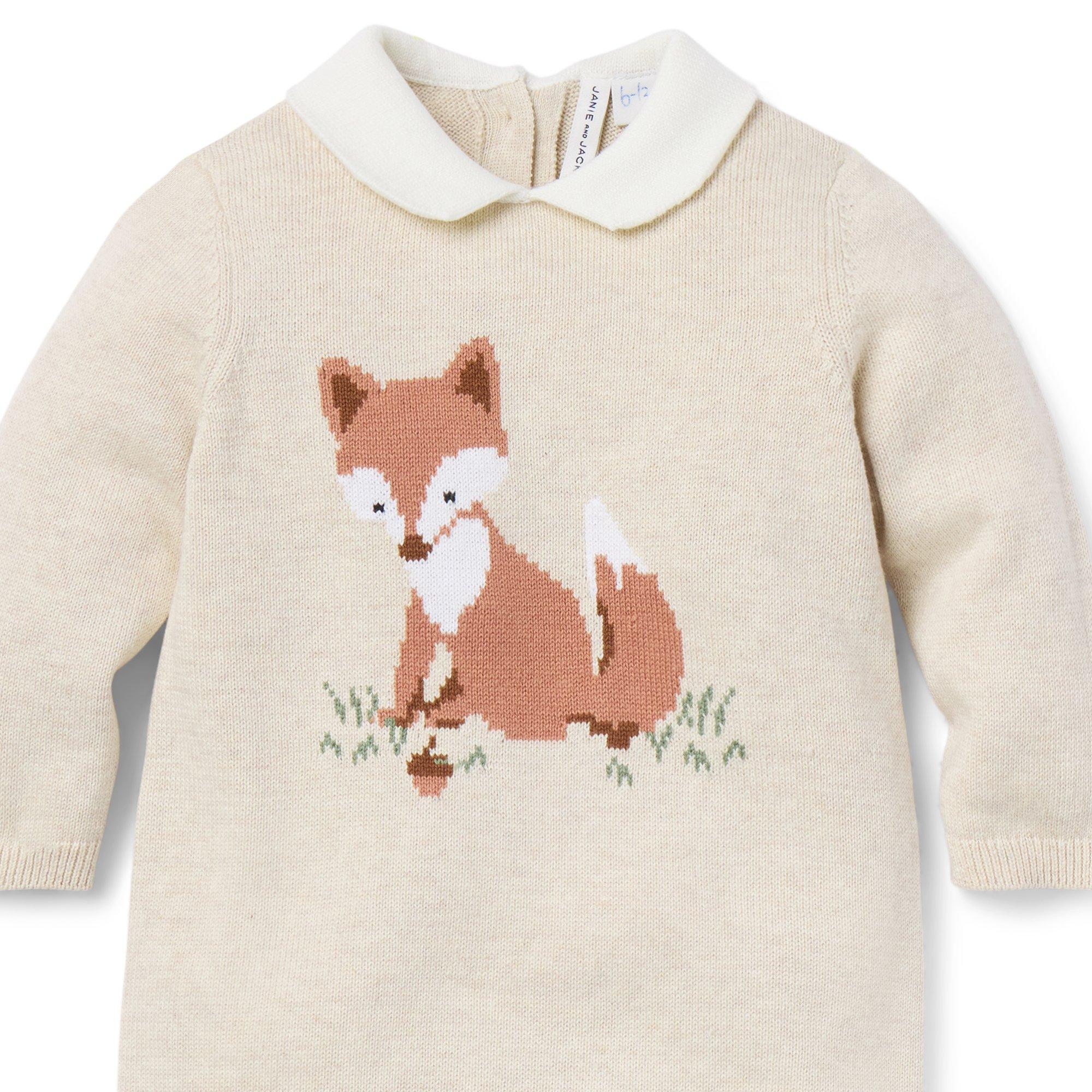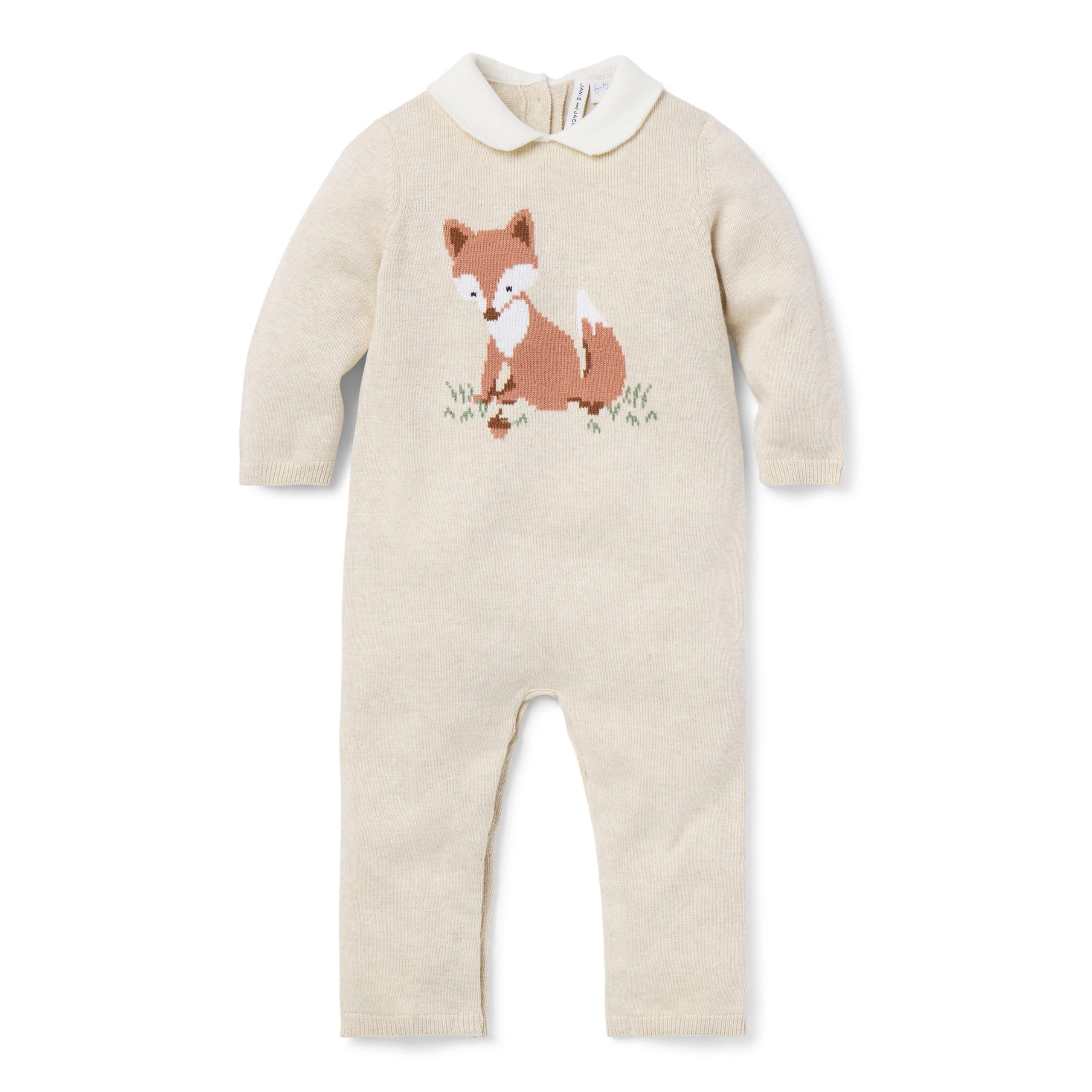 • We love this knit one-piece for cozy first moments. In pure cotton with an intarsia-knit fox design and a Peter Pan collar, plus a little back pocket too.