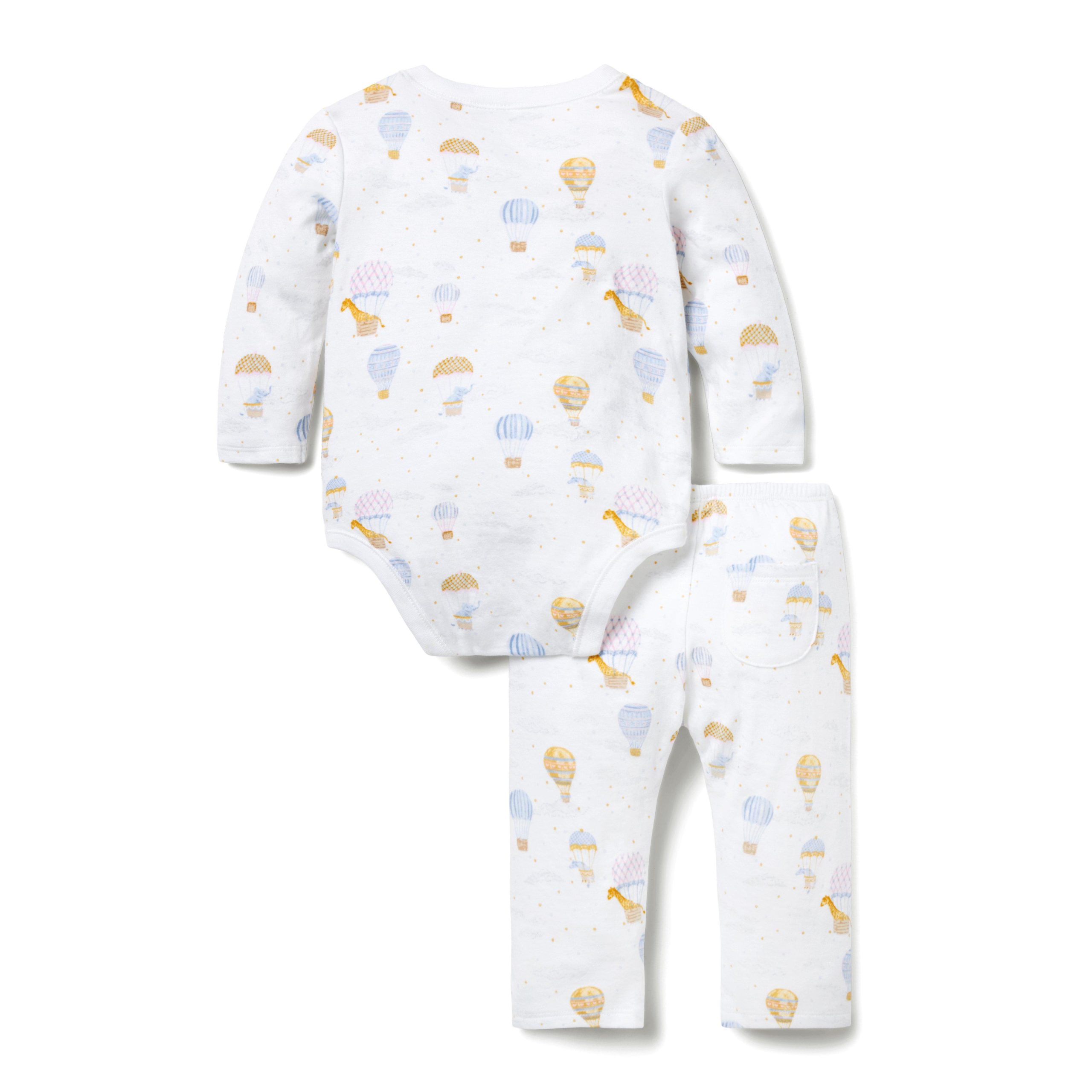 • Welcome baby in our soft cotton set with a playful hot air balloon animal print. Featuring a kimono-inspired wrap bodysuit and a pull-on pant with a little back pocket, just because.