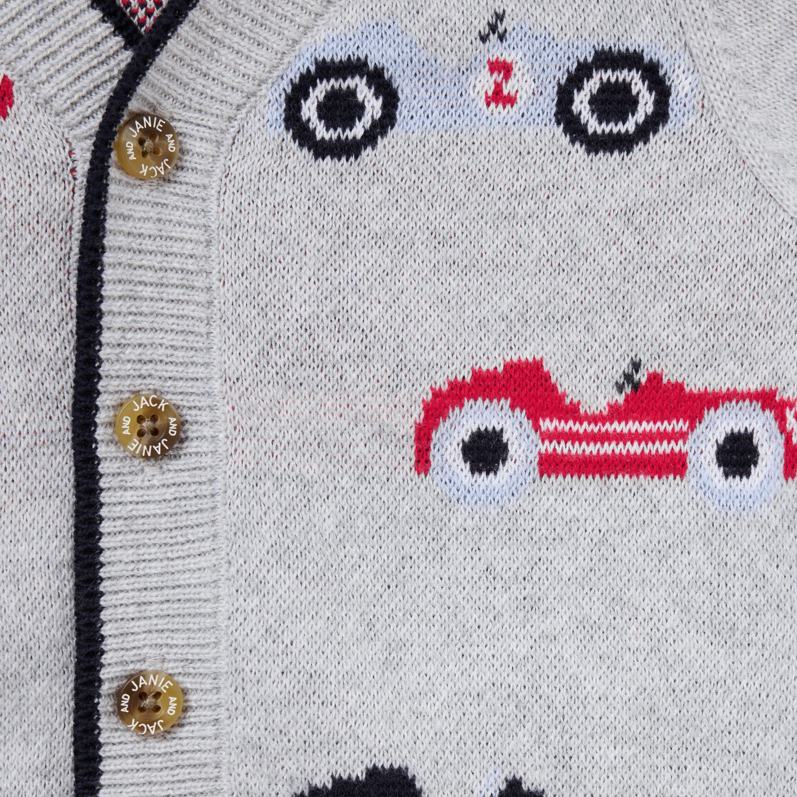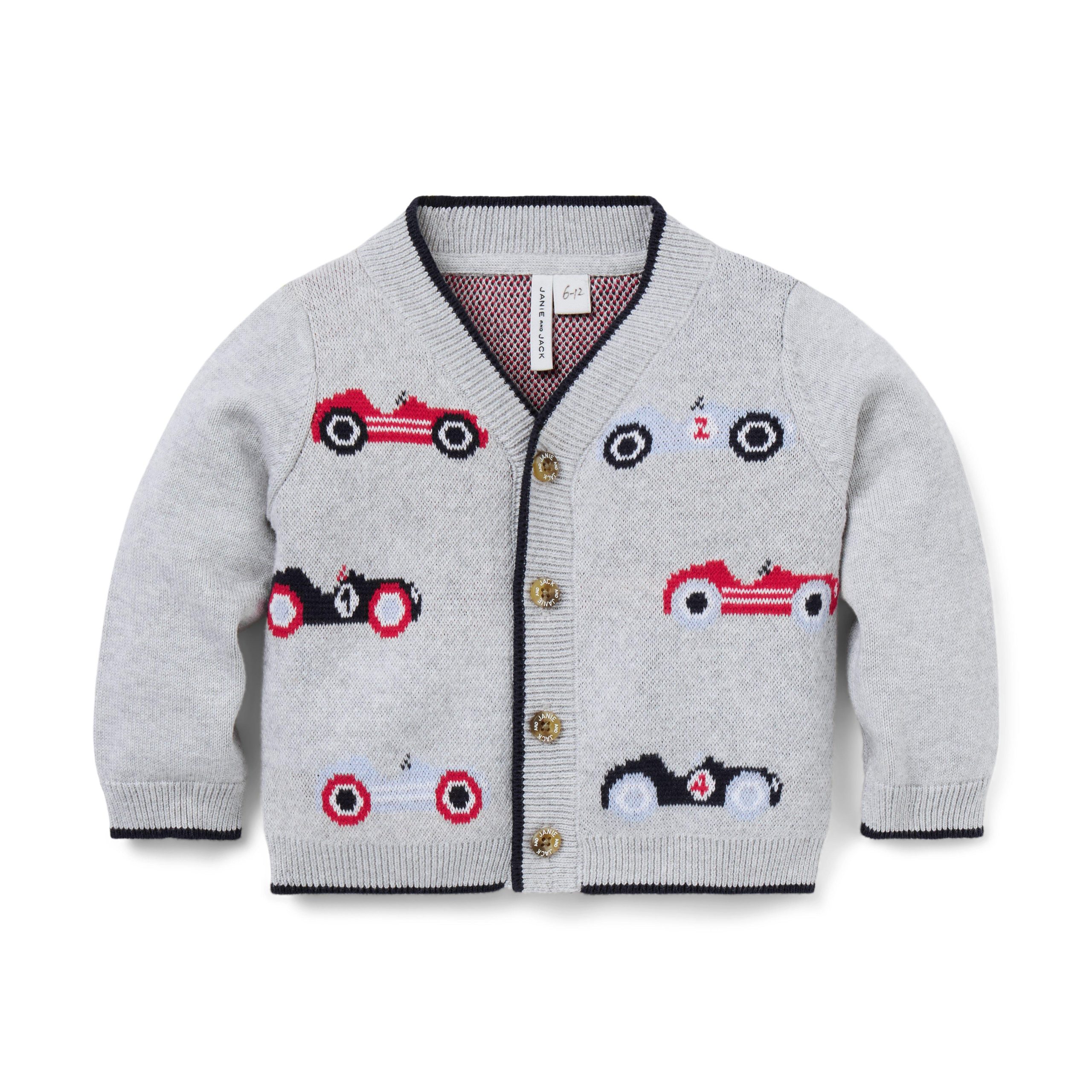 • A winning look for cozy first moments. Our cardigan in soft, pure cotton features allover intarsia-knit race cars, sporty stripes and ribbed details too.