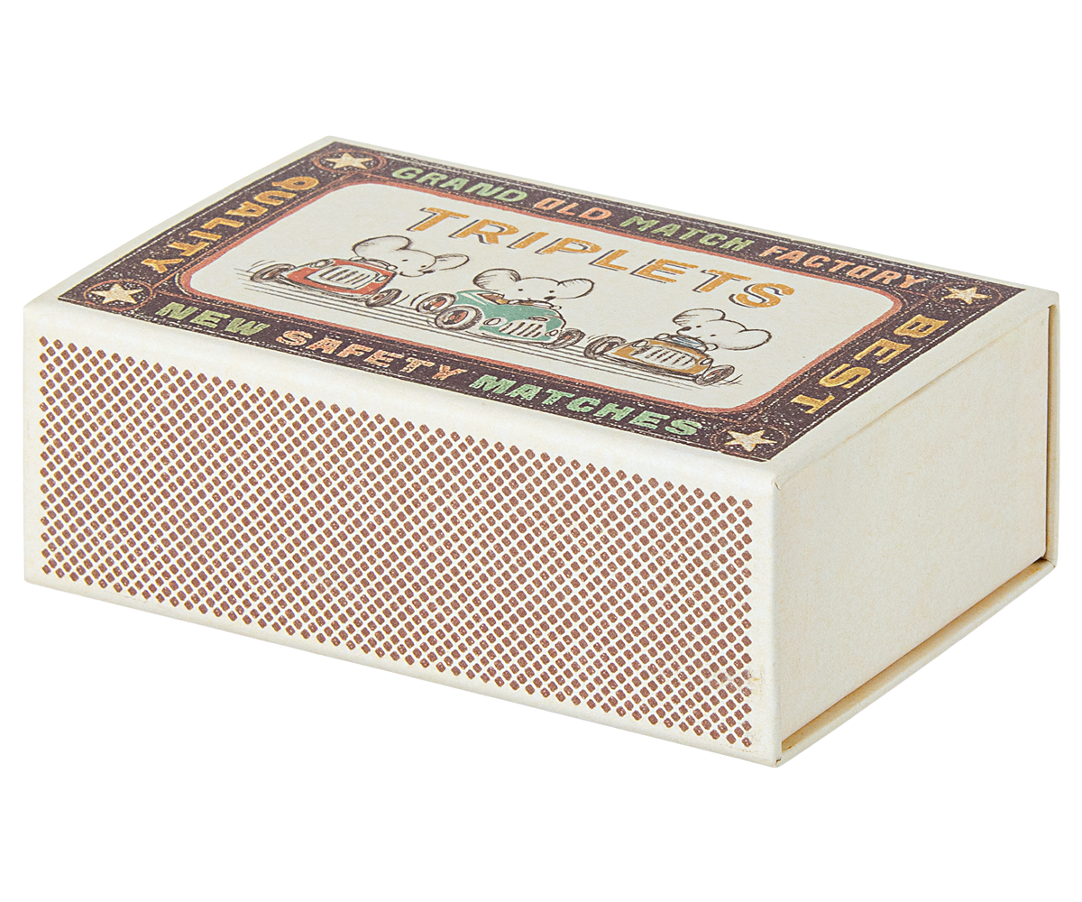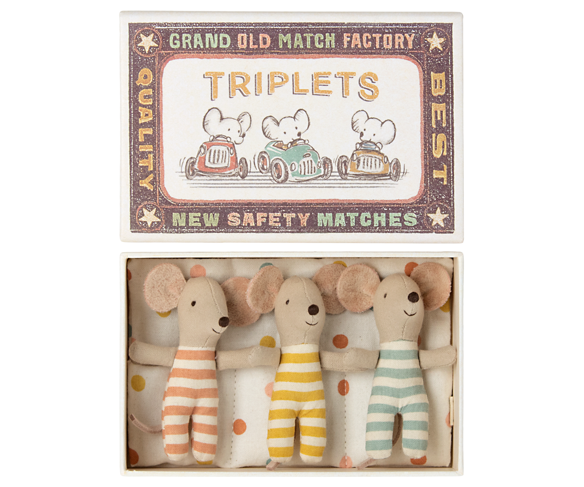 Surprise! It’s triplets! Not two, but three baby mice in a box! They cosy up together in their box to sleep and keep their mummy on her toes during the day. Dressed in complementary stripes, they come cuddled together in blanketed pockets.