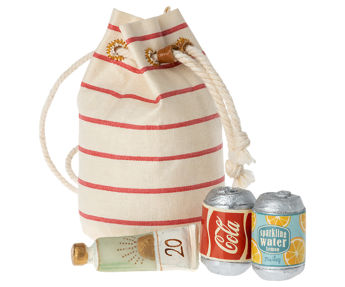 • Vacation time! This small bag includes all must-haves for a day in the sun: sunscreen and 2 sodas. All made in miniature size that fits the smallest Maileg friends. Please note that the sunscreen and soda cans can not be opened.