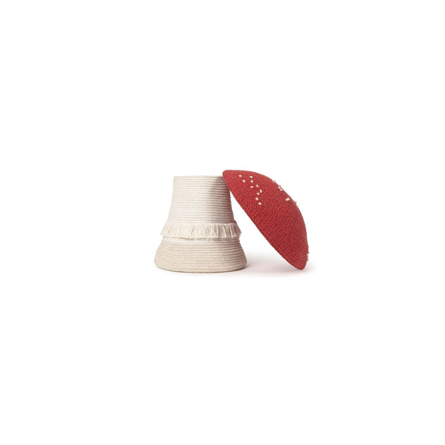 Two pieces in one. This charming basket handcrafted with meticulous detail, featuring knots that represent the mushroom’s white spots and delicate fringes on the trunk.