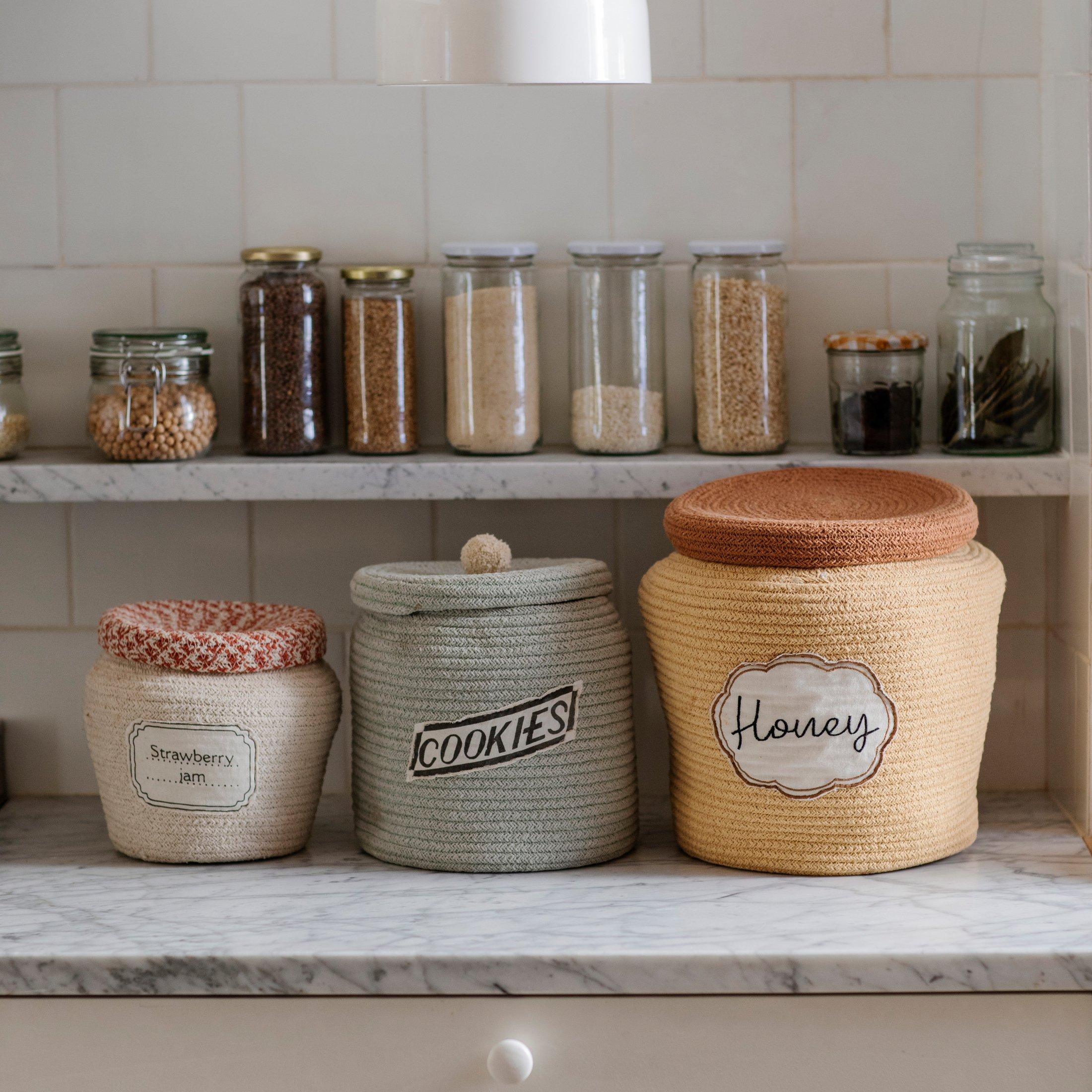 Your little ones’ dream: a jar full of cookies! The Cookie Jar basket is handcrafted using a braided cord made of fibers from recycled PET-bottles mixed with our cotton colors. Both the base and the lid are made in Blue Sage, and the basket comes with an embroidered jar label indicating “COOKIES”
