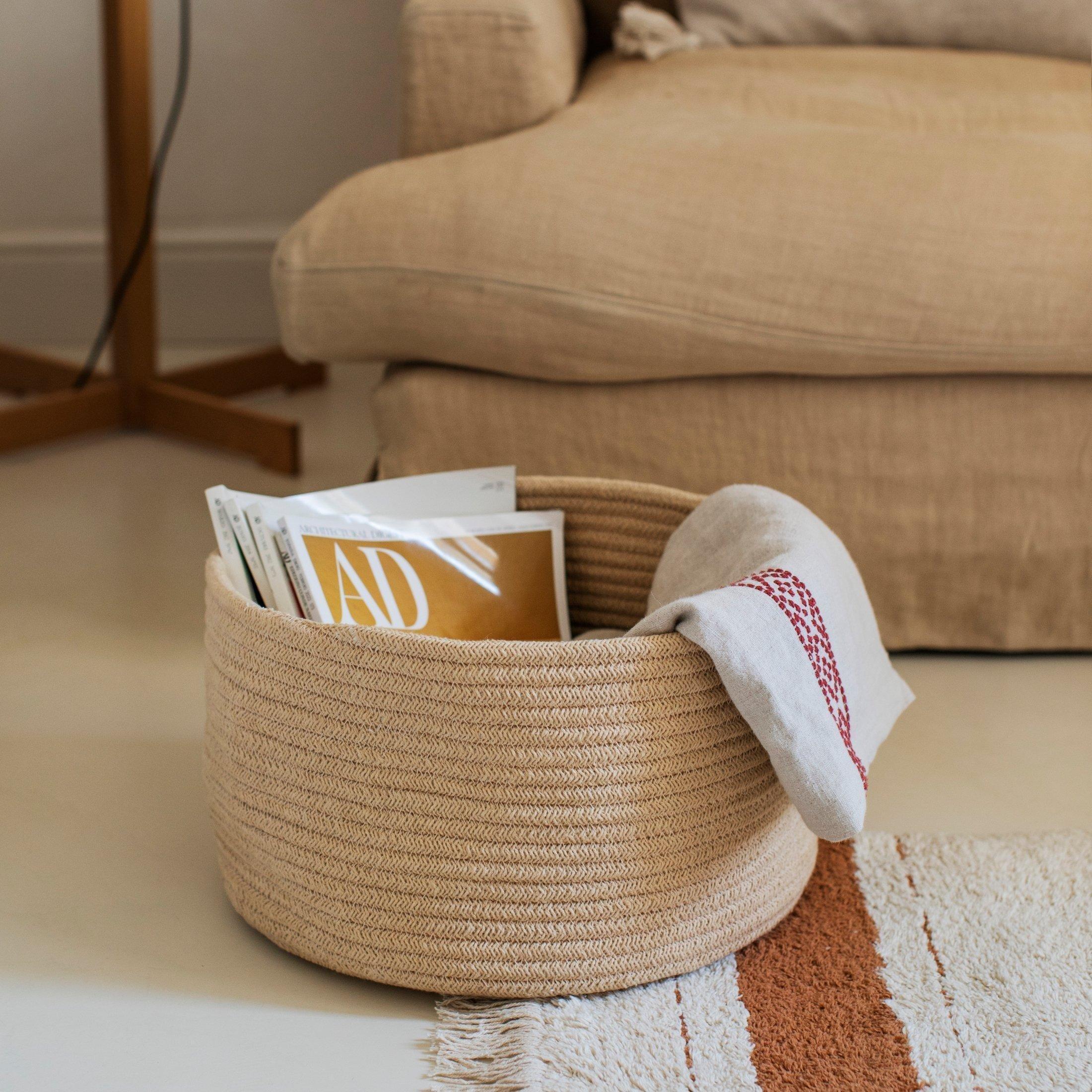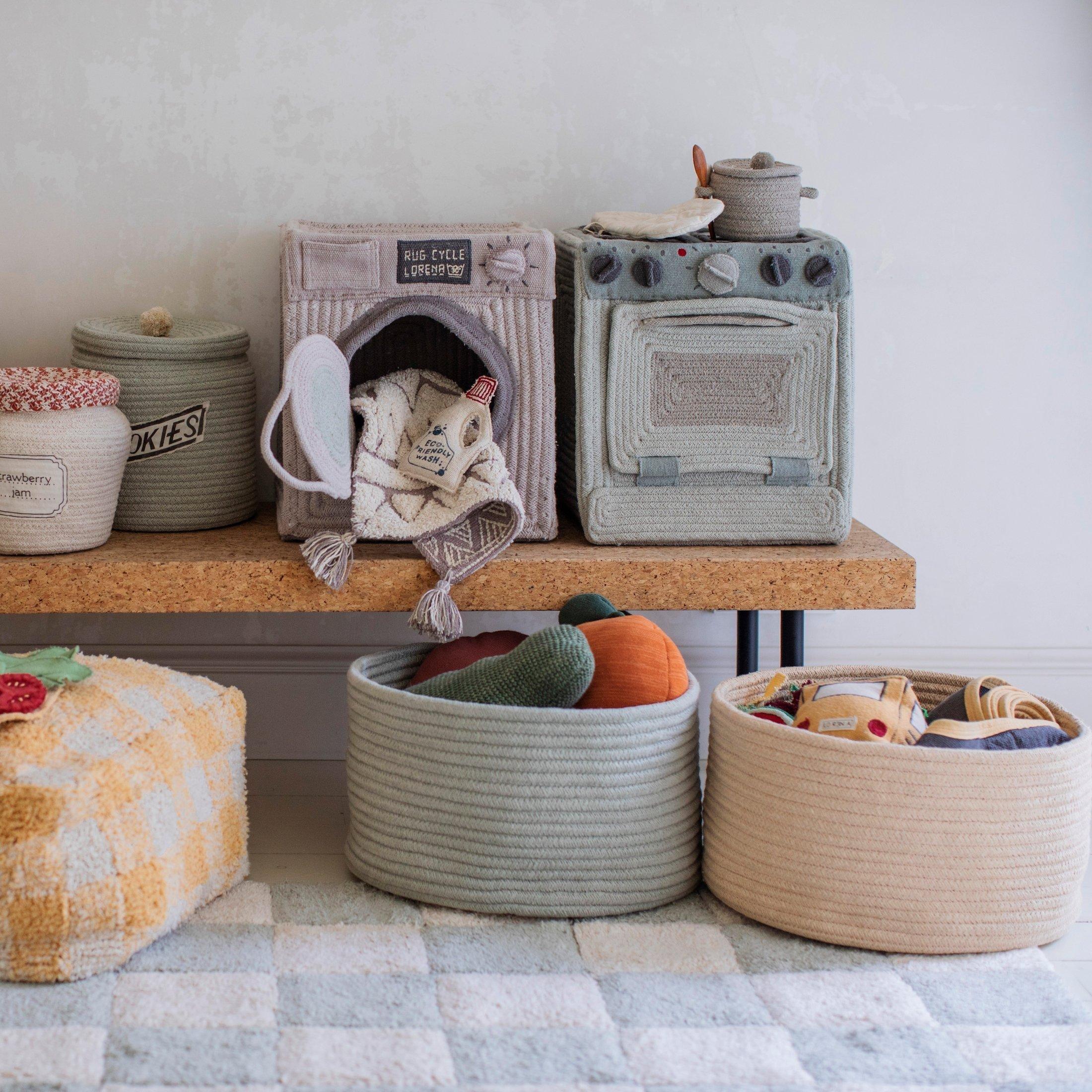• A practical round basket of braided thick cords made of fibers from recycled PET-bottles mixed with our cotton colors.  The thicker PET yarn cord gives the basket more stability. Available In new fresh colors combining perfectly with the Kitchen collection as well as realier launched collections.