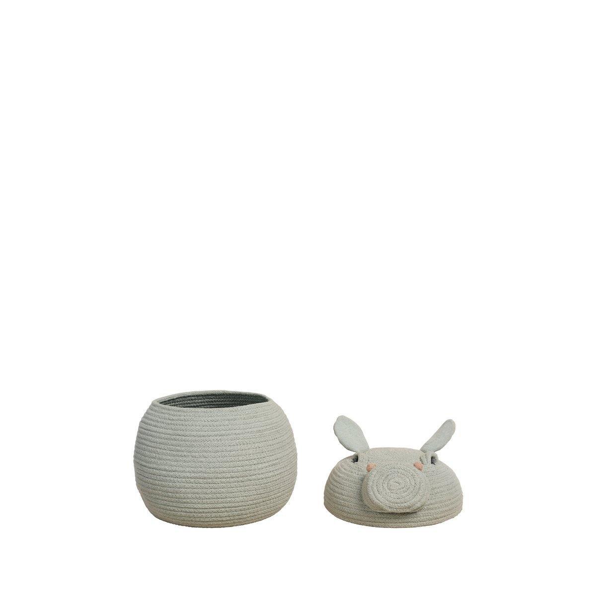 Carefully Handcrafted using a braided cord made of fibers from recycled PET-bottles covered by our cotton yarns in Blue Sage color, Henry the Hippo basket has a big rounded nose with nostrils in rose color, and folded canvas ears.