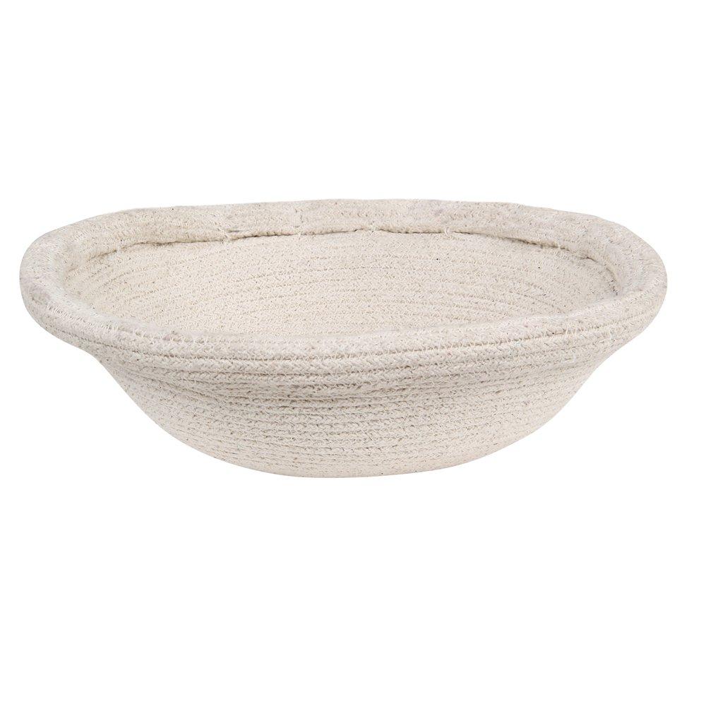 Mushroom shaped basket consisting of two separate pieces. Bottom basket is thick at the bottom and narrow at the top, made in Natural and mixed Linen cotton cord with contrast stitches in Soil Brown. Top basket in natural cotton cord with inside folded edges.