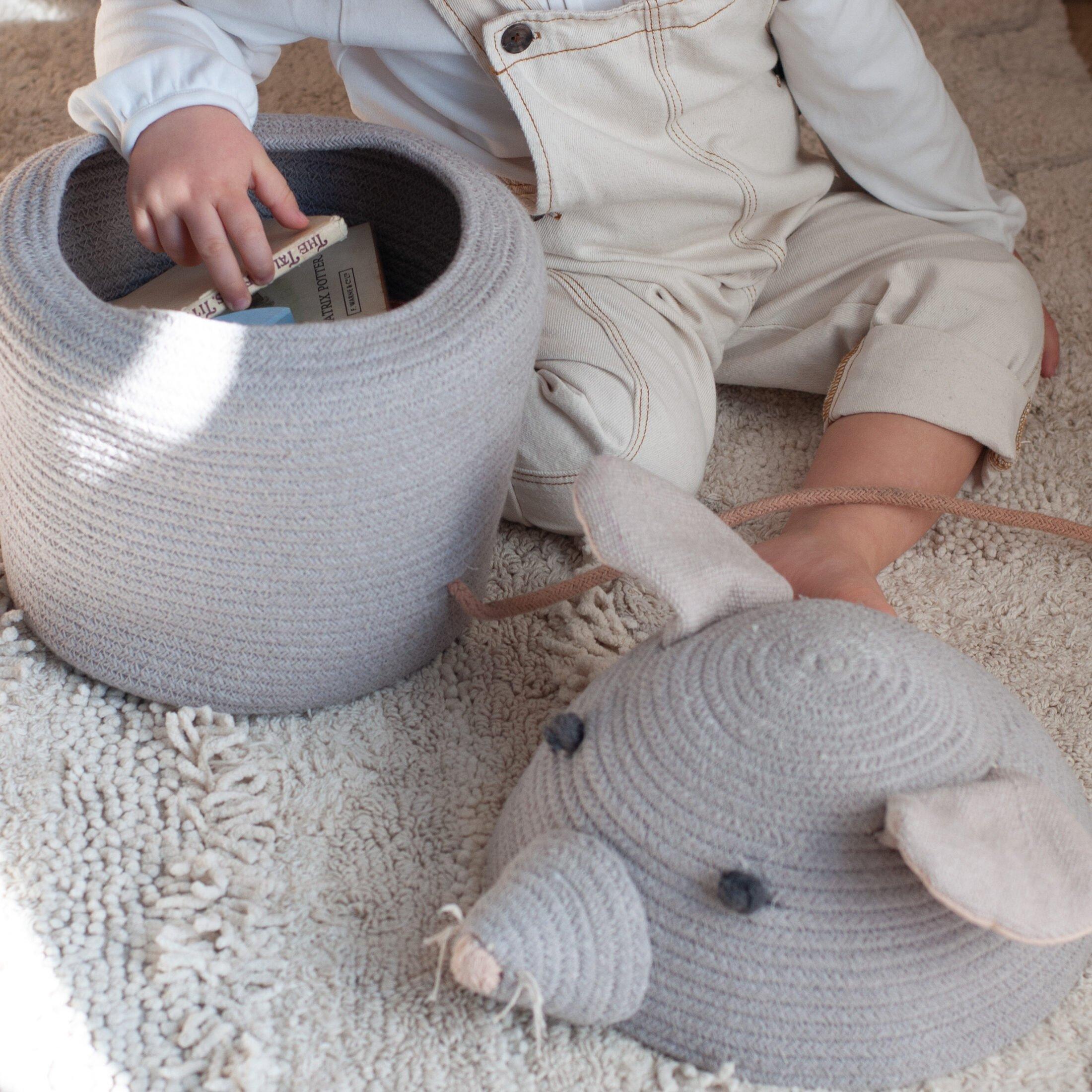 Curious as a rat, Renata the Rat basket is handcrafted using braided cords made of fibers from recycled PET-bottles mixed with our cotton colors. With a slightly cone shaped bottom part in Pearl Grey color and an embroidered pointy nose, the gray canvas ears and the pink long tail gives the final touch to this basket.