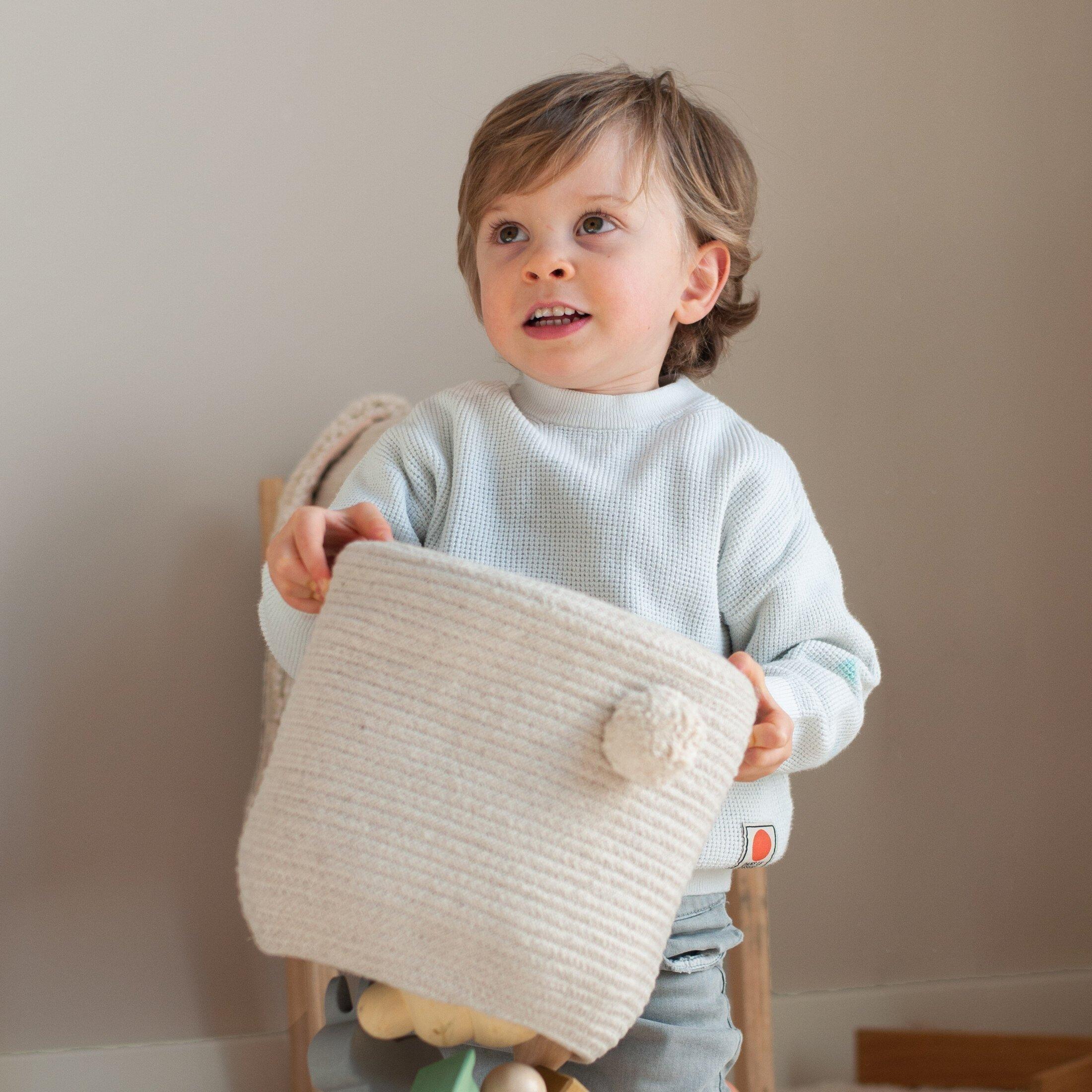 An oval-shaped basket in natural color, handcrafted using braided cords made of fibers from recycled PET-bottles mixed with our cotton. With extra long soft tufted ears and a rounded nose, Rita the Rabbit basket is finished with a big cotton pompom as a tail.