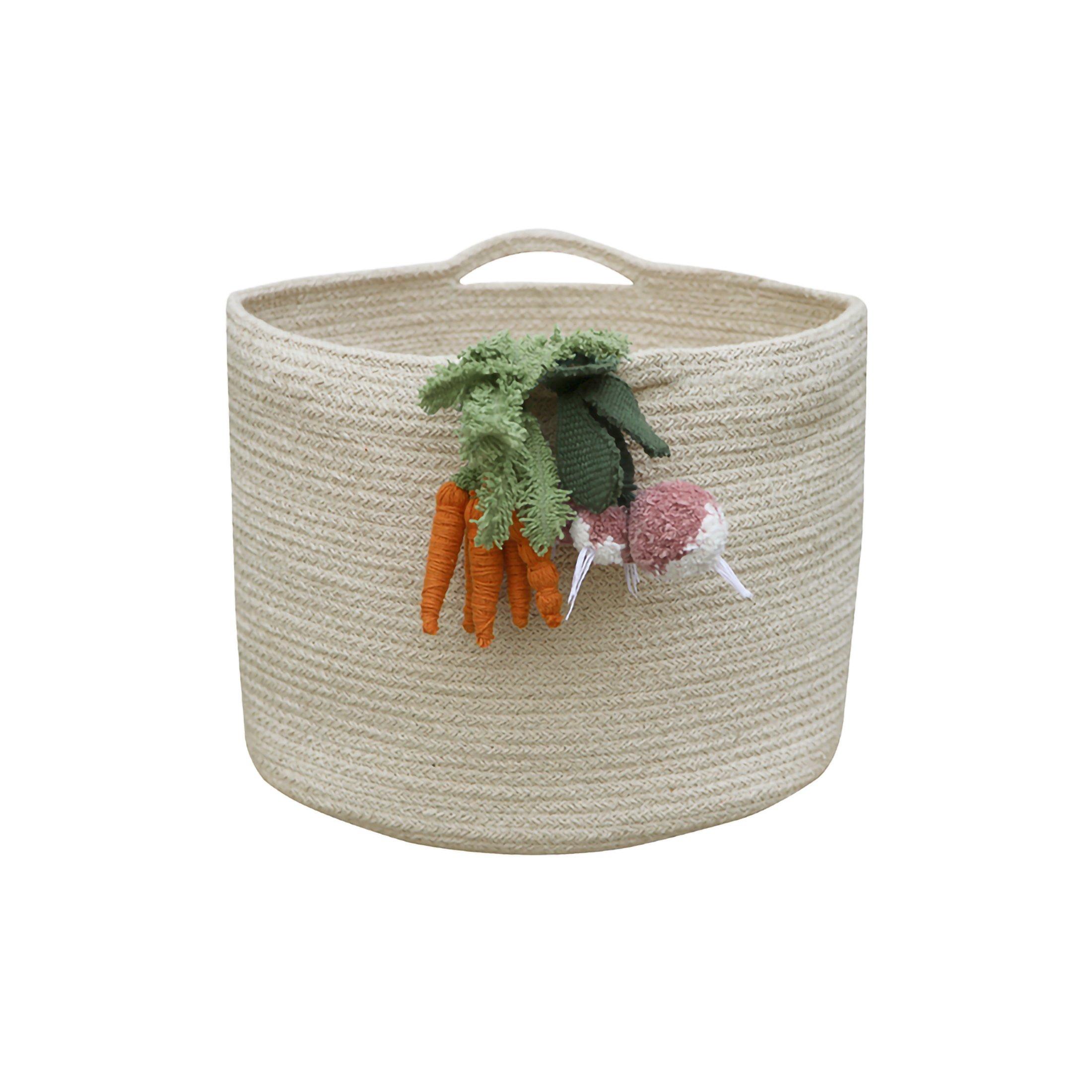 Basket made of braided cotton cords in natural color. The basket has two handles and is decorated with two bundles of handmade veggies attached to one of the handles.