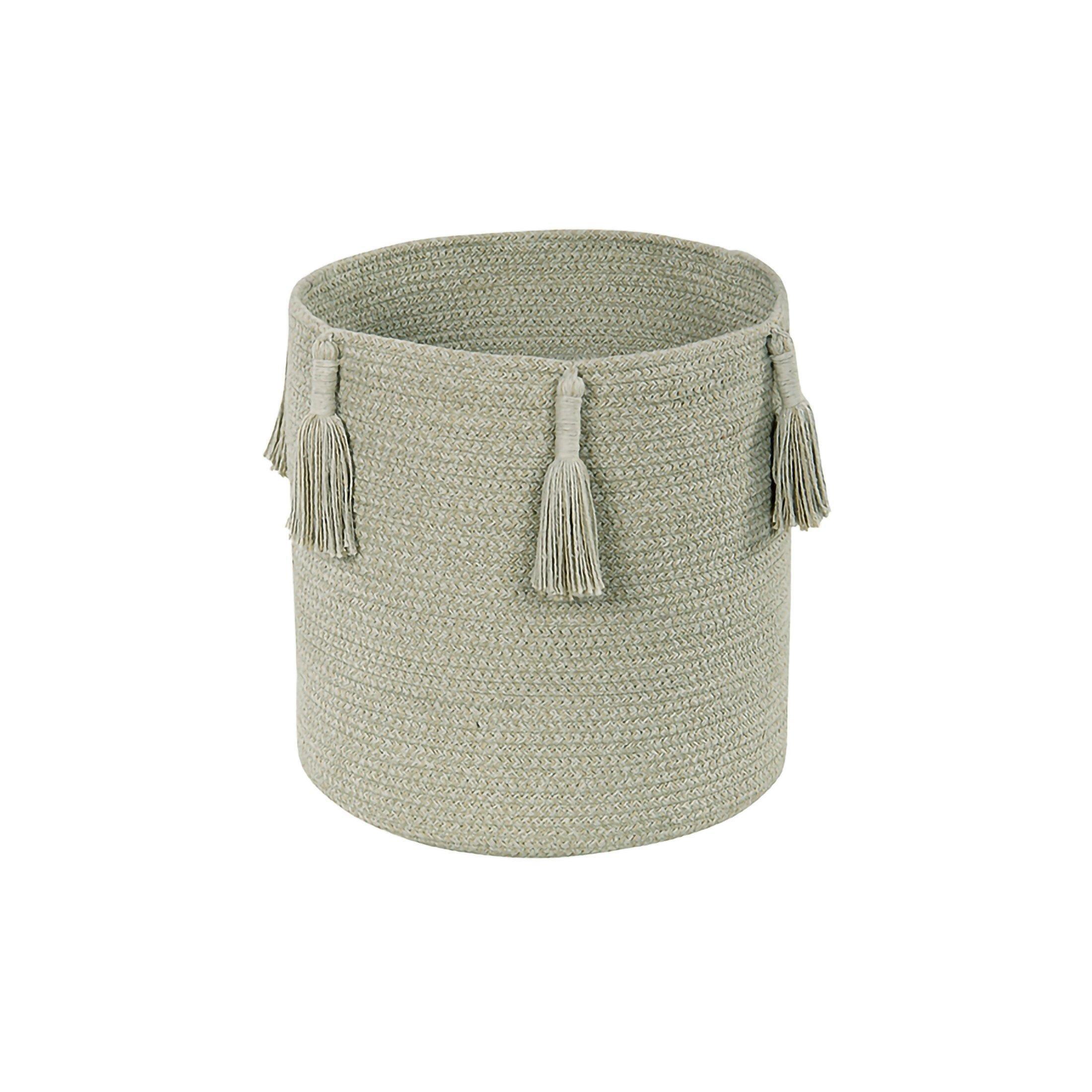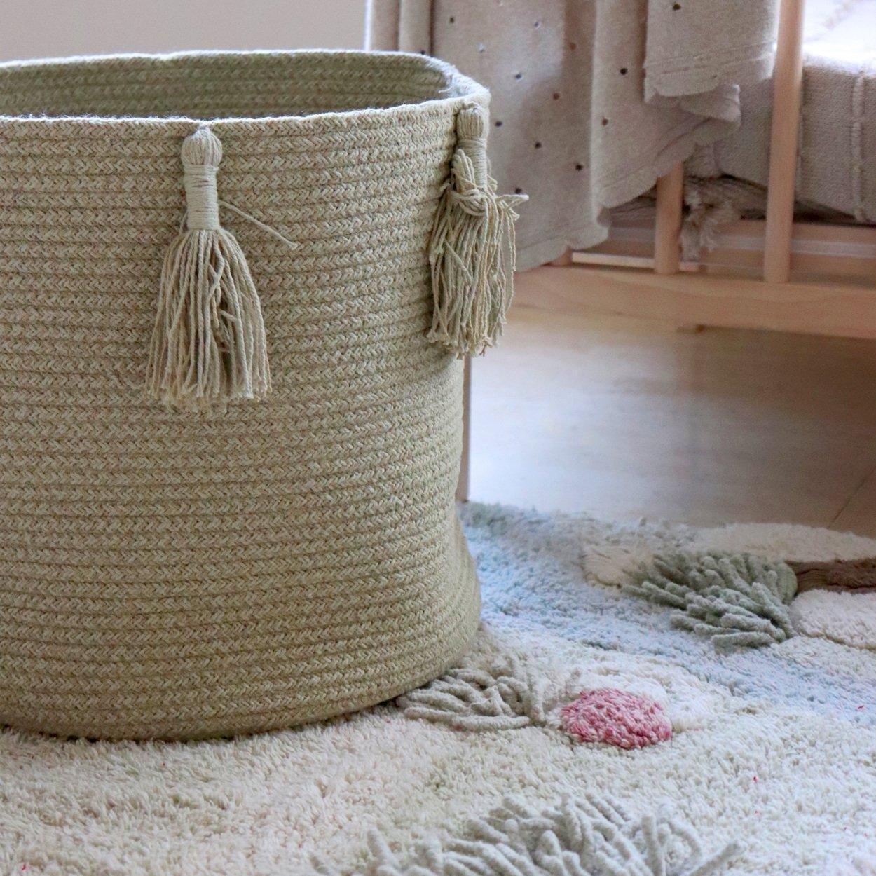 Combining two color shades to achieve the ever-changing color tones of the nature, the round Woody basket is made using mixed cotton cords in Olive and Dark Olive. Finished with handcrafted mixed color tassels attached to the edge.