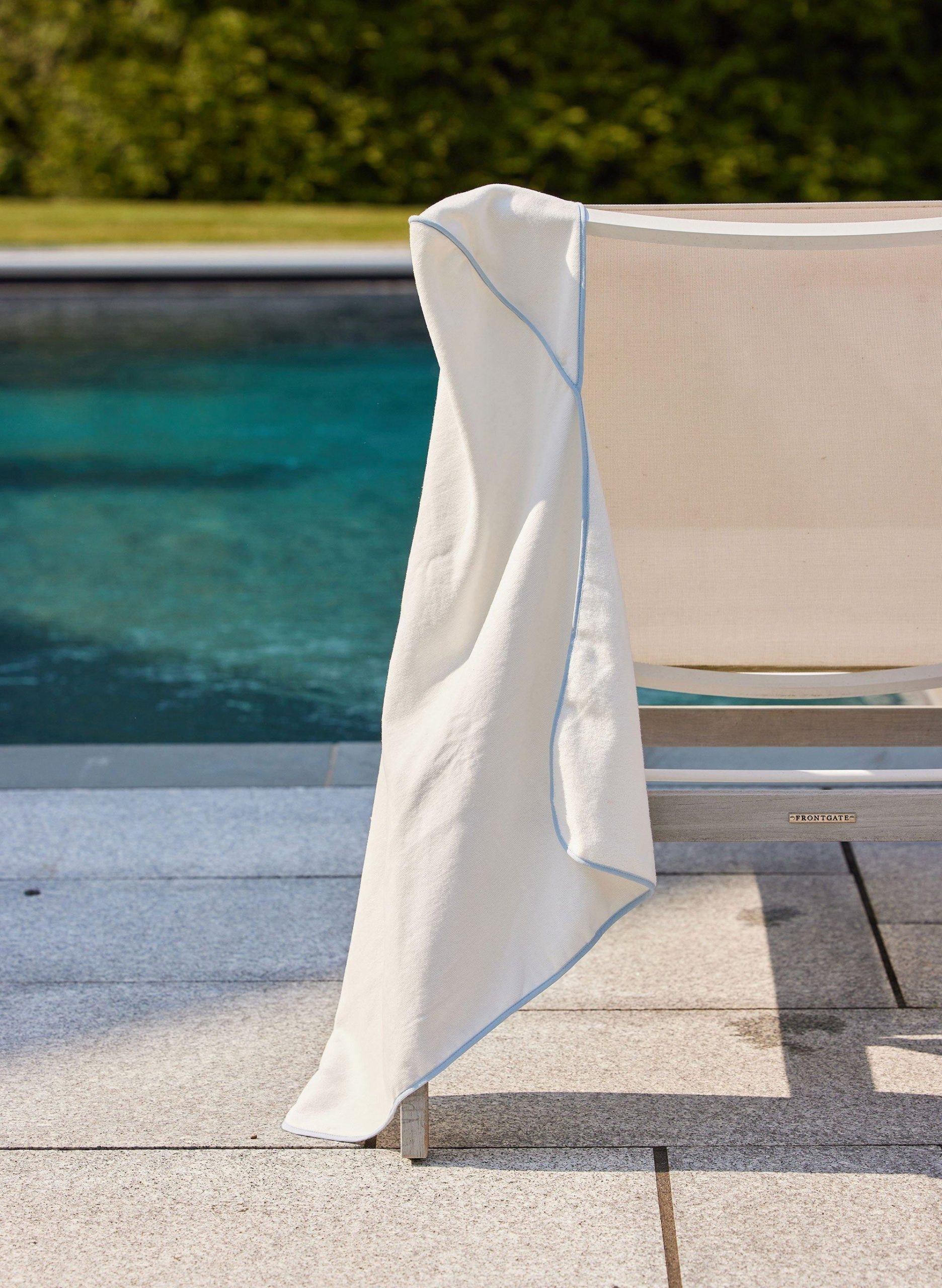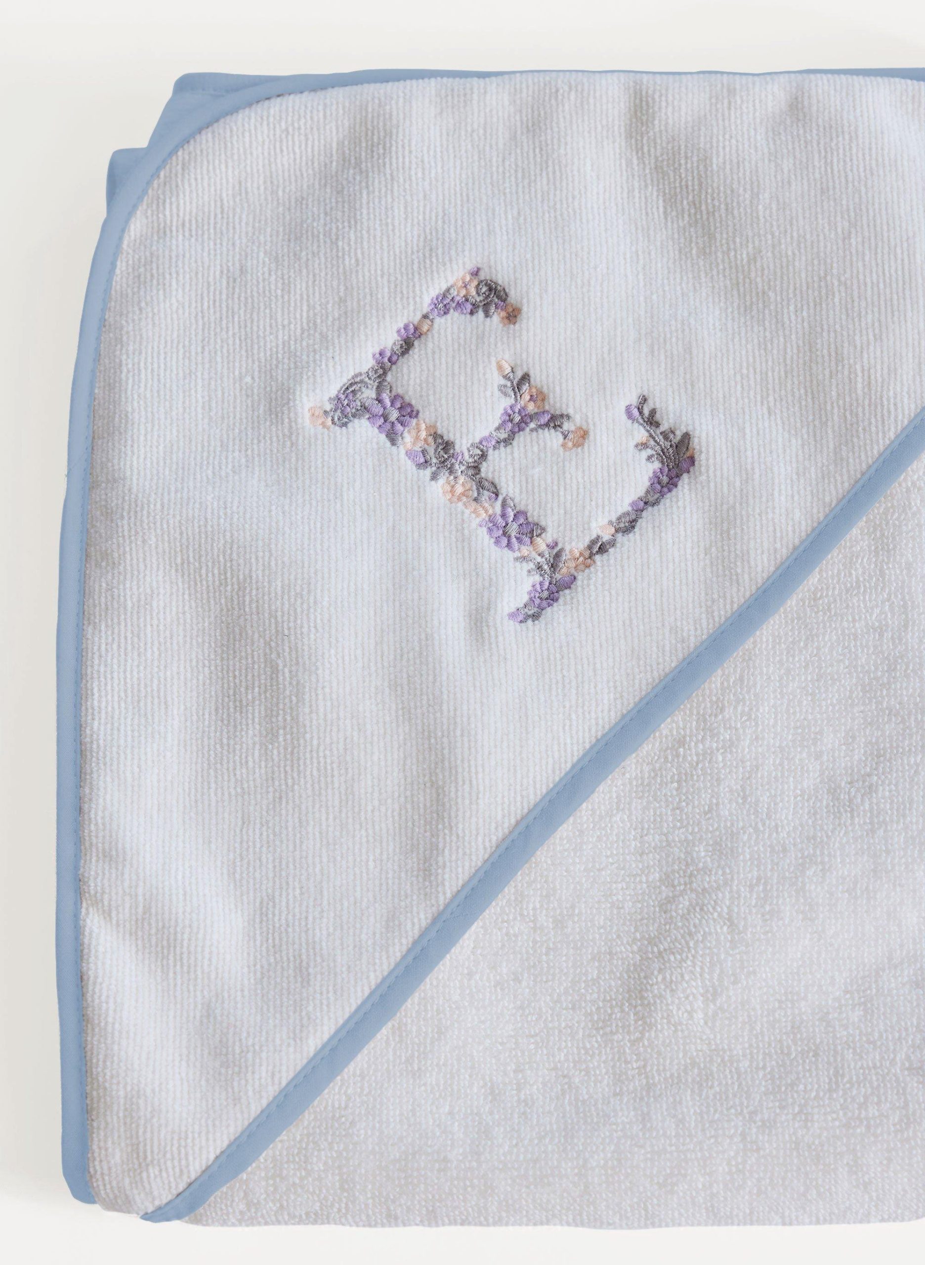 • Velour terry finished with cornflower blue binding.
