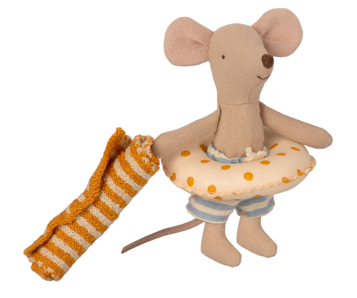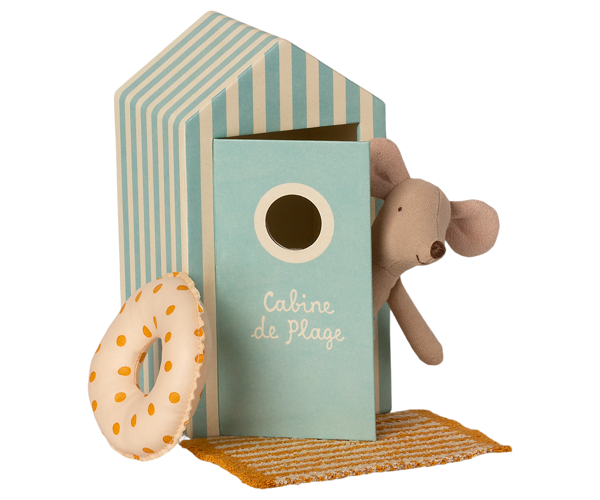 | Vacation time! This mouse is ready for a day at the beach, with needed accessories and a beautiful striped beach house. As one of the smallest family members he, of course, has a float to keep him safe. |