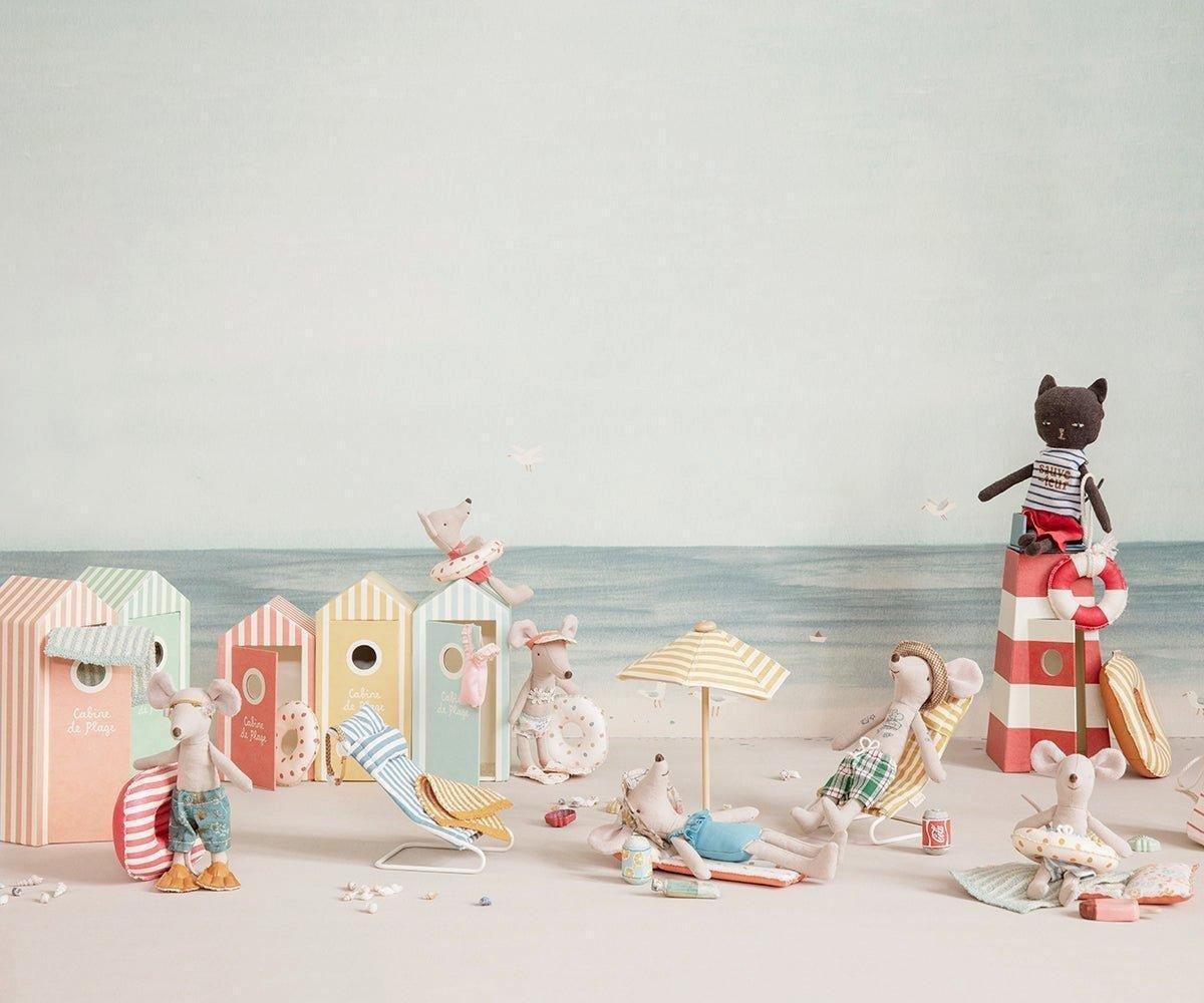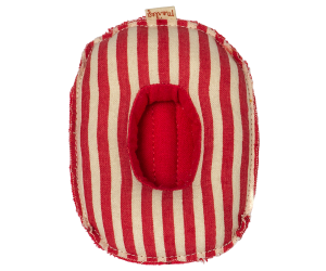 Vacation time! This small boat is made in coated fabric for an authentic raft look. This look includes tousled, beachy edges complete with charming white stitching. It is not waterproof. It can float on water only in your bright imagination! This set fits little brother/sister and baby mice sizes. *Mouse not included |