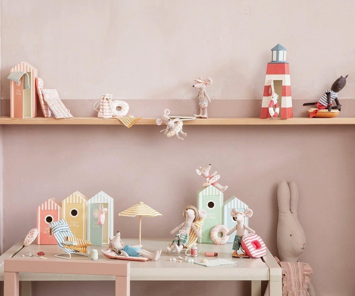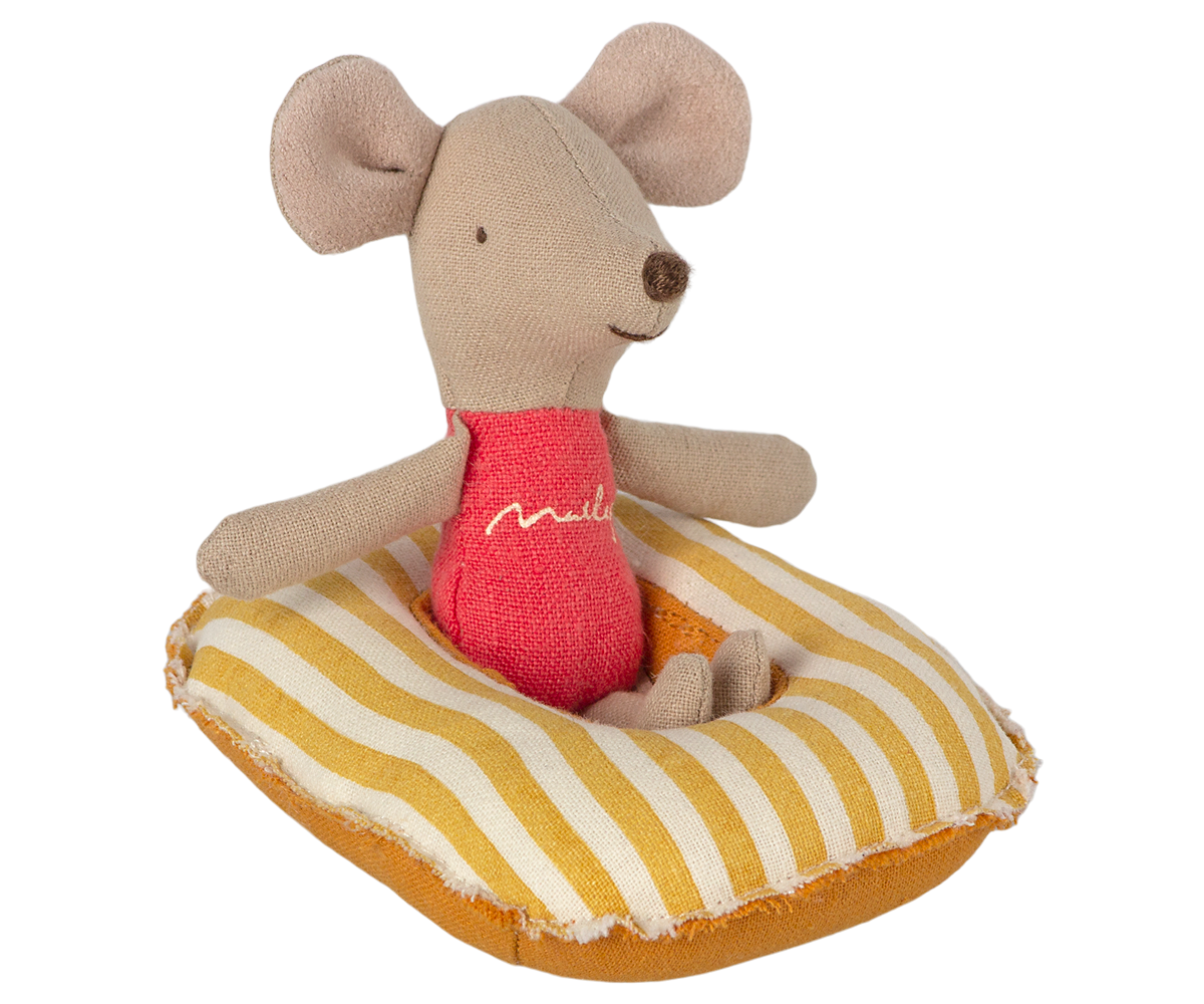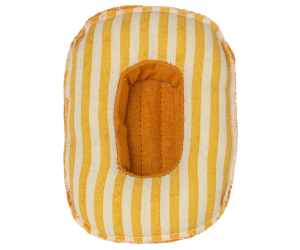 Vacation time! This small boat is made in coated fabric for an authentic raft look. This look includes tousled, beachy edges complete with charming white stitching. It is not waterproof. It can float on water only in your bright imagination! This set fits little brother/sister and baby mice sizes. *Mouse not included The Raft is 4 inches long and 2.8 inches wide. |