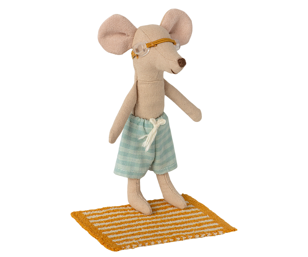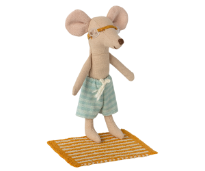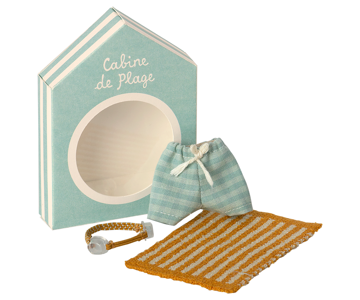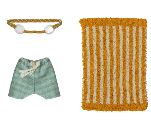 | Vacation time. This set includes all essential accessories for a fun day at the beach: trunks, goggles, and a towel. It all fits the mice in size big brother/sister perfectly. |