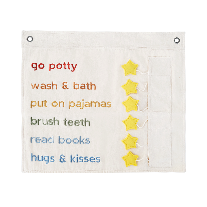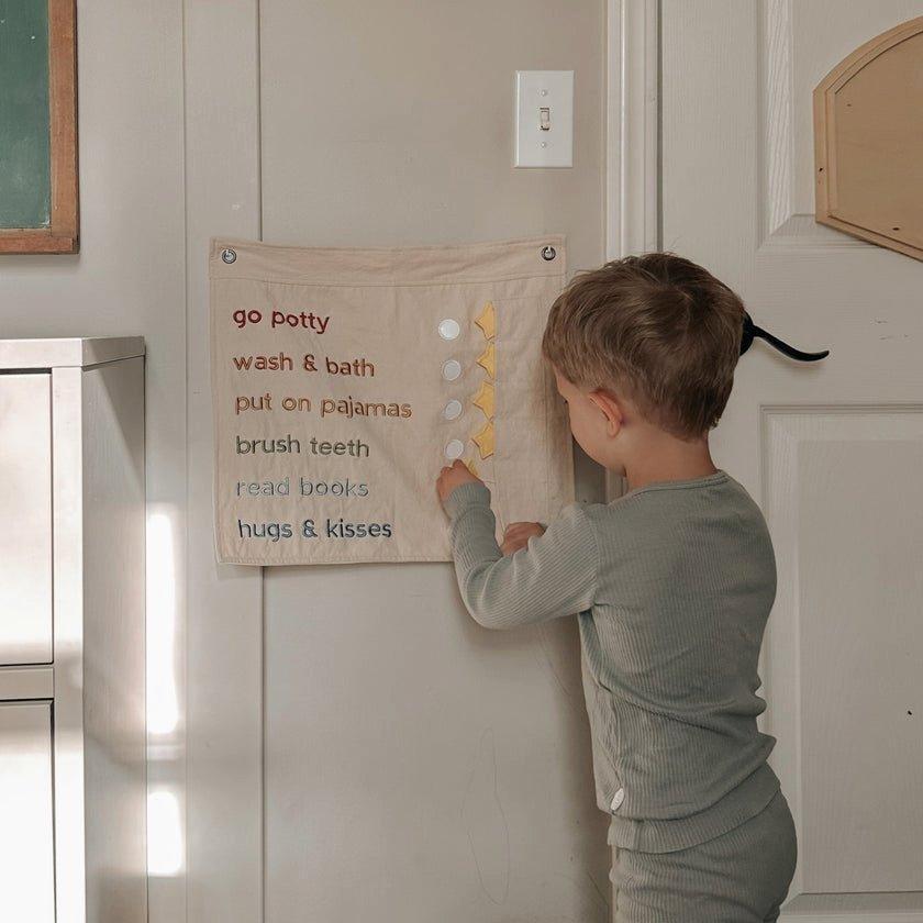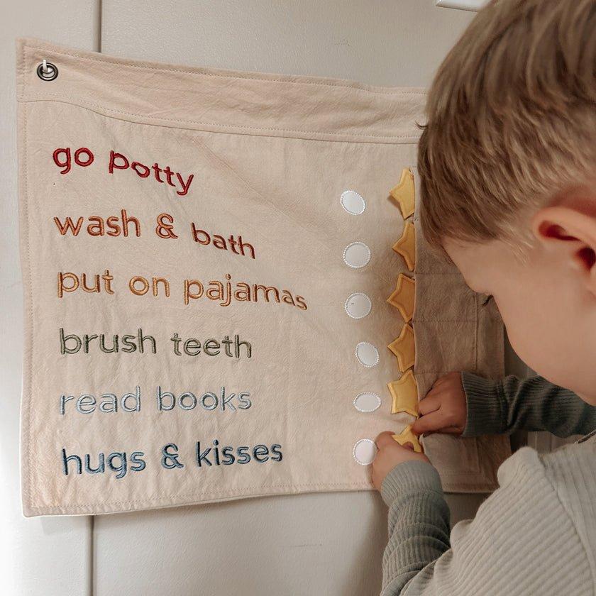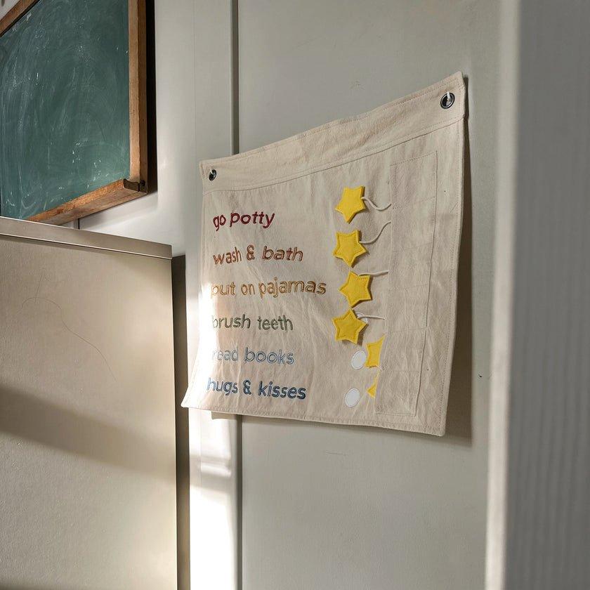 • Help your little one breeze through bedtime with this playful and practical checklist banner! Designed with Montessori principles in mind, this banner turns routines into a fun, hands-on activity. Your toddler can pull the colorful star from the pockets and stick it on each task as they complete it—brushing teeth, putting on PJs, and more!
