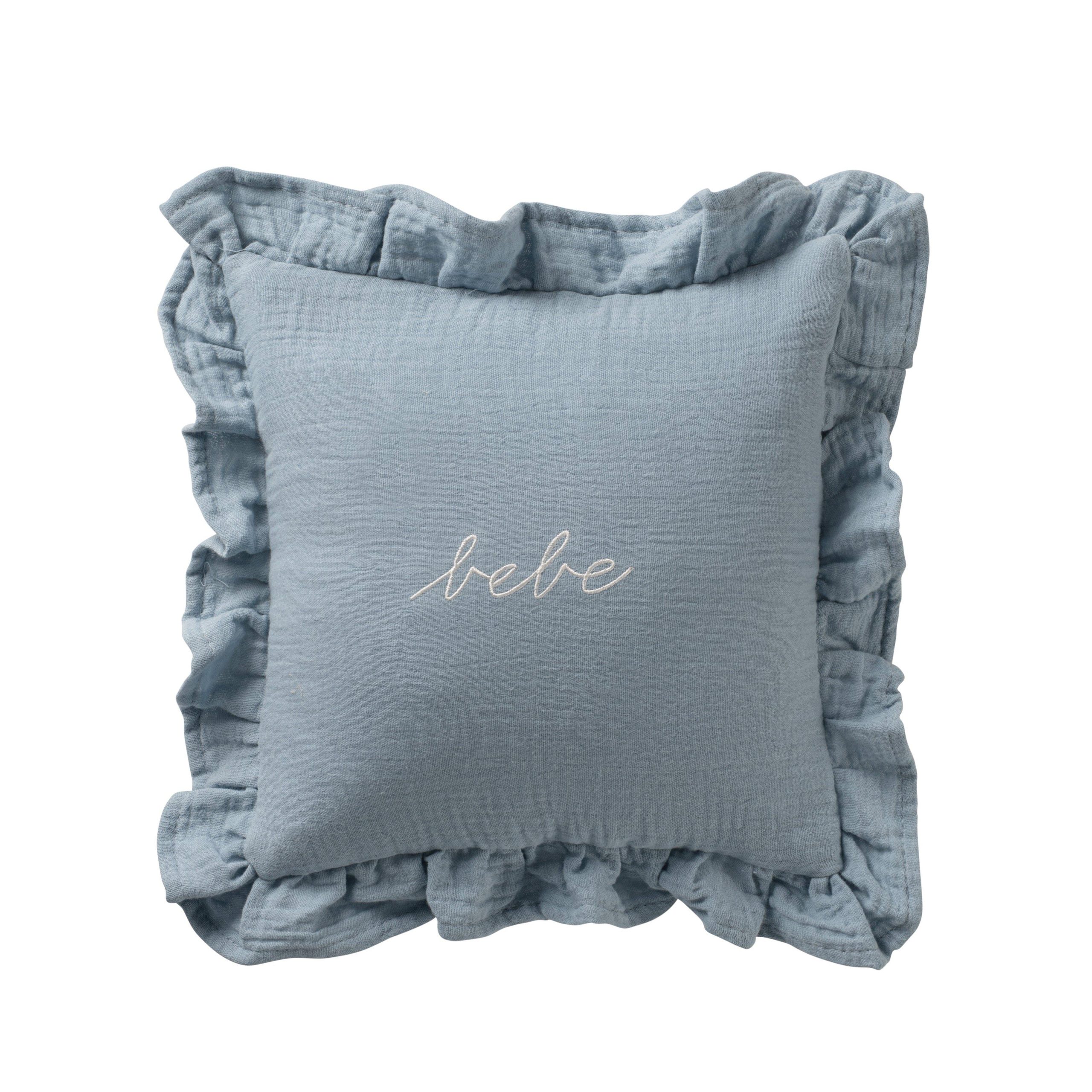 Sweet little ruffles frame our “bebe” embroidered gauze pillow.
