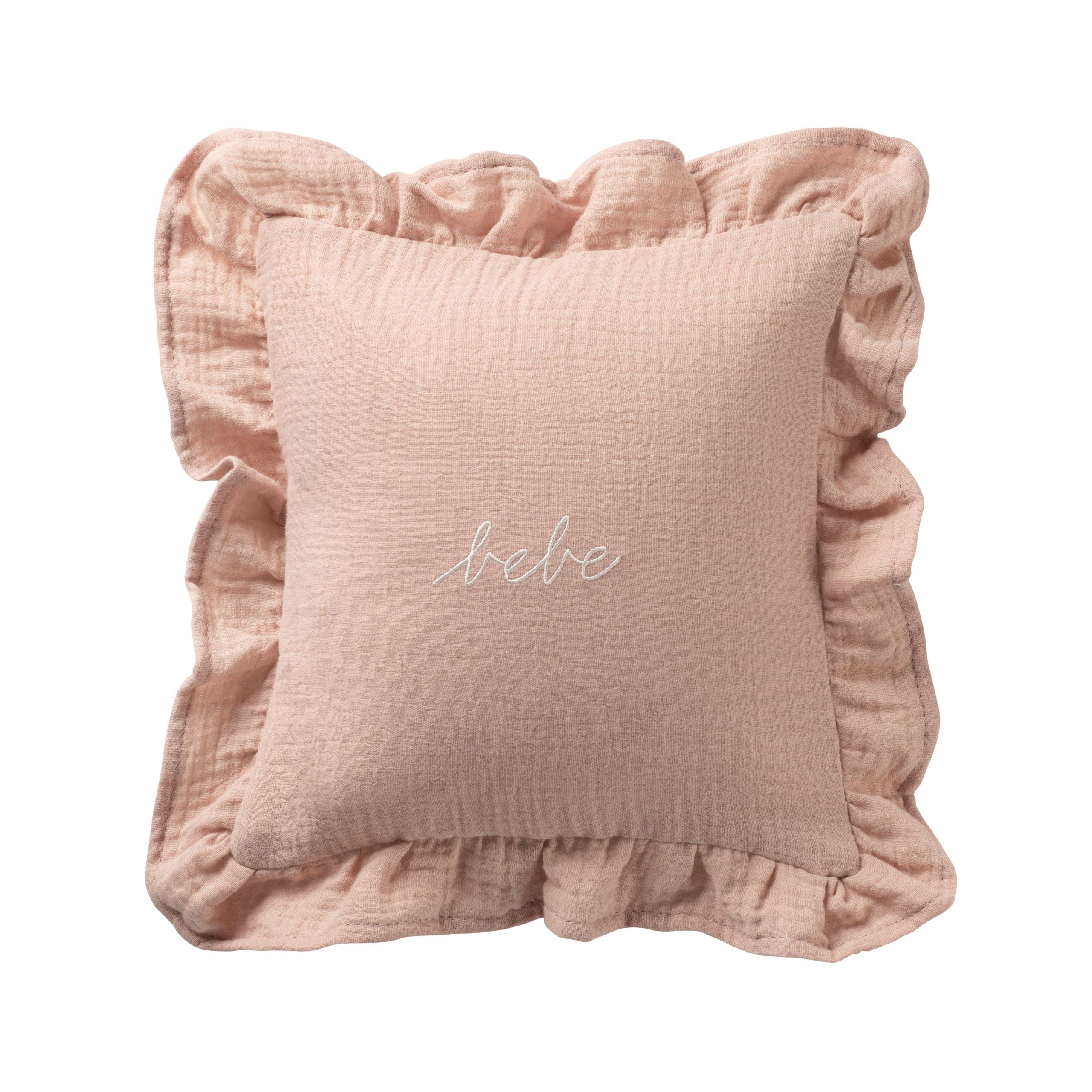 Sweet little ruffles frame our “bebe” embroidered gauze pillow.