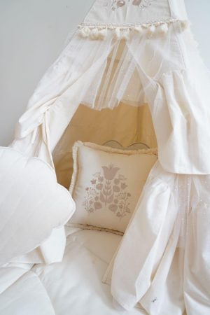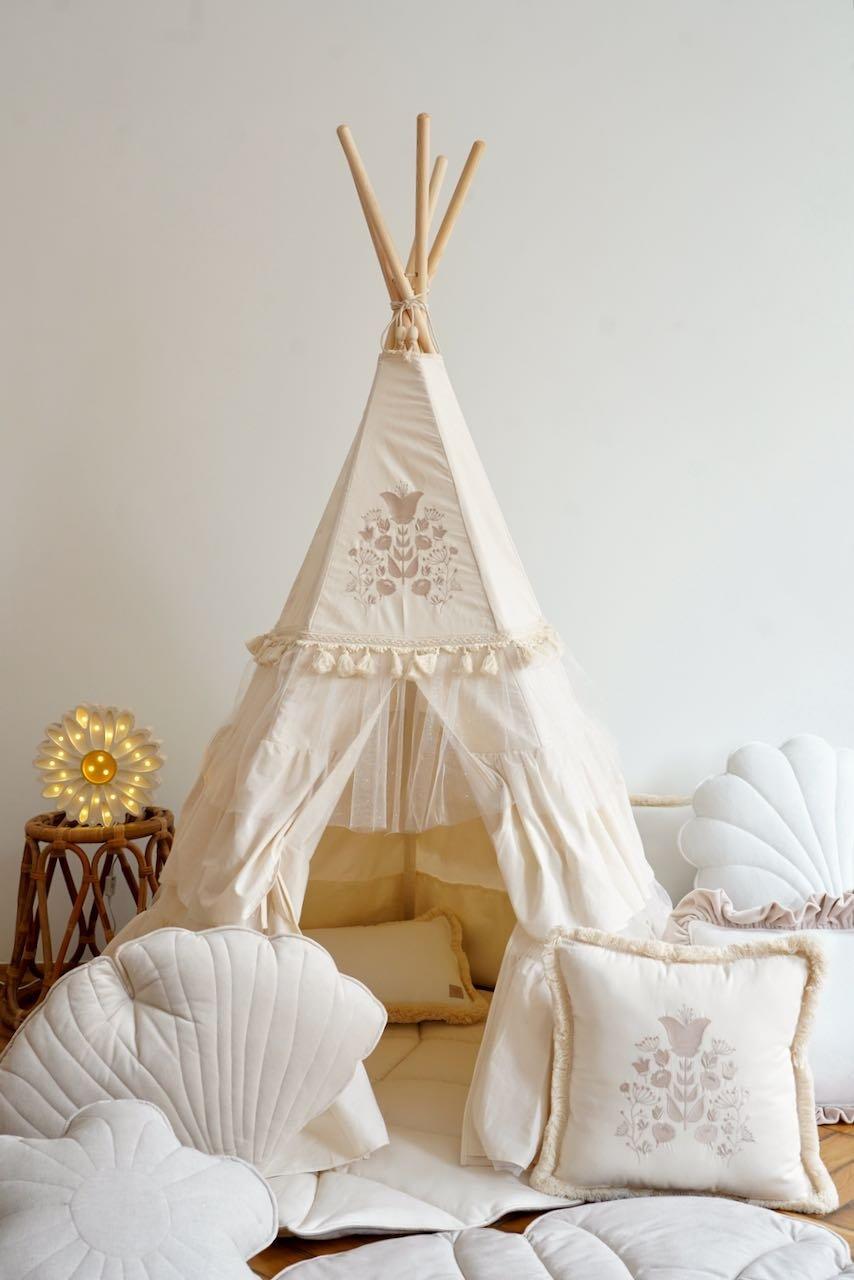 Your little adventurer may spend long hours exploring the world and playing, but upon return he or she needs a place to rest, eat, and make plans for further adventures. A teepee literally means a dwelling, and is a word used by the Sioux, the indigenous people of the Great Plains. It is a space for all kinds of fun. When the play is finished, you can pack the teepee back in the cover and put it away, for example, in the corner of the room. It does not take much space when folded, and the cover enables you to easily take it outdoors. There is a pocket inside where children can hide their toys, books and other treasures. PART OF THE BOHO STYLE COLLECTION Boho is an artistic bohemian style guided by comfort, summer and freedom. You’ll find some ethnic references here and there, a number of flowers where possible, and naturalness – a nod to Mother Nature. Our “Boho” teepee with frills and embroidery, firmly sewn from thick cotton fabric, ornamented with beautiful embroidery in bright colours and numerous frills with gold motifs. Perfect for little royalty! Made of natural materials: 1% cotton fabric and pine poles. Thanks to its five-wall structure, the tent is stable when it is put up, the poles are rounded and placed in tunnels sewn together at the bottom. The teepee is perfect to use at home, in the garden or at the beach. The set includes a play tent, poles and a cotton cover. Feel free to complement it with our beautiful decorations and accessories. Fabric: 1% OEKO-TEX® certified cotton. Fabric weight: 7.67 Washing temperature: up to 86°F. Pine poles: 7.9 in. Height when put up: 66.9 in. Base diameter: 47/52 in. PART OF THE BOHO STYLE COLLECTION