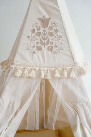 The “Boho” Teepee with Frills and Embroidery is firmly sewn from thick cotton fabric and decorated with beautiful embroidery in bright colors and numerous frills with gold motifs.