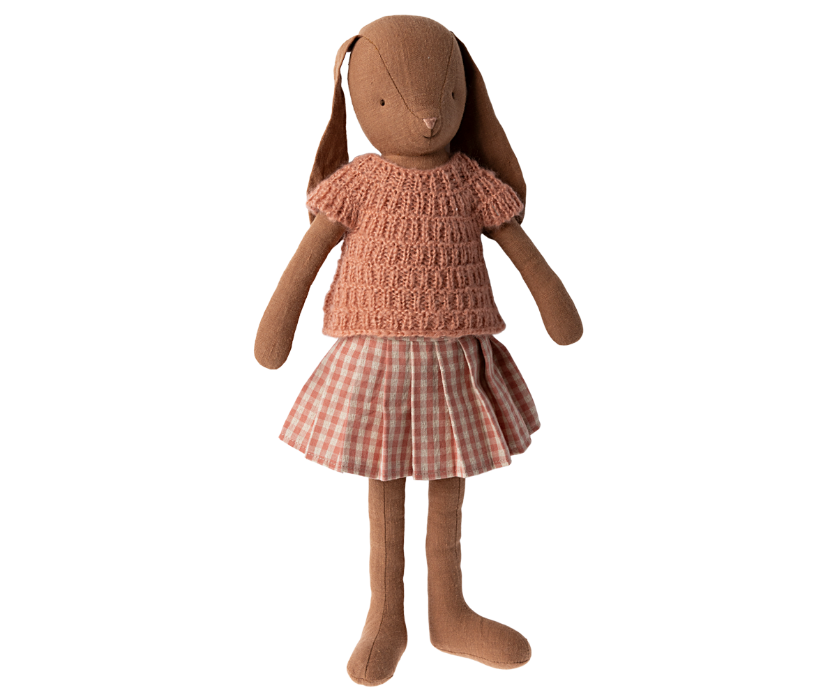 • A classic bunny made of soft natural fabrics that gives a lovely hand feel and look. She is dressed up with a skirt and a knitted shirt. Check out our clothes collection to expand the bunny’s wardrobe.