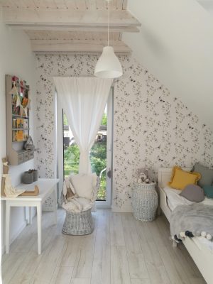 To apply the wallpaper, you will need: a delicate wallpaper glue, a clean paint roller for flattening, and a sharp knife suitable for cutting paper.