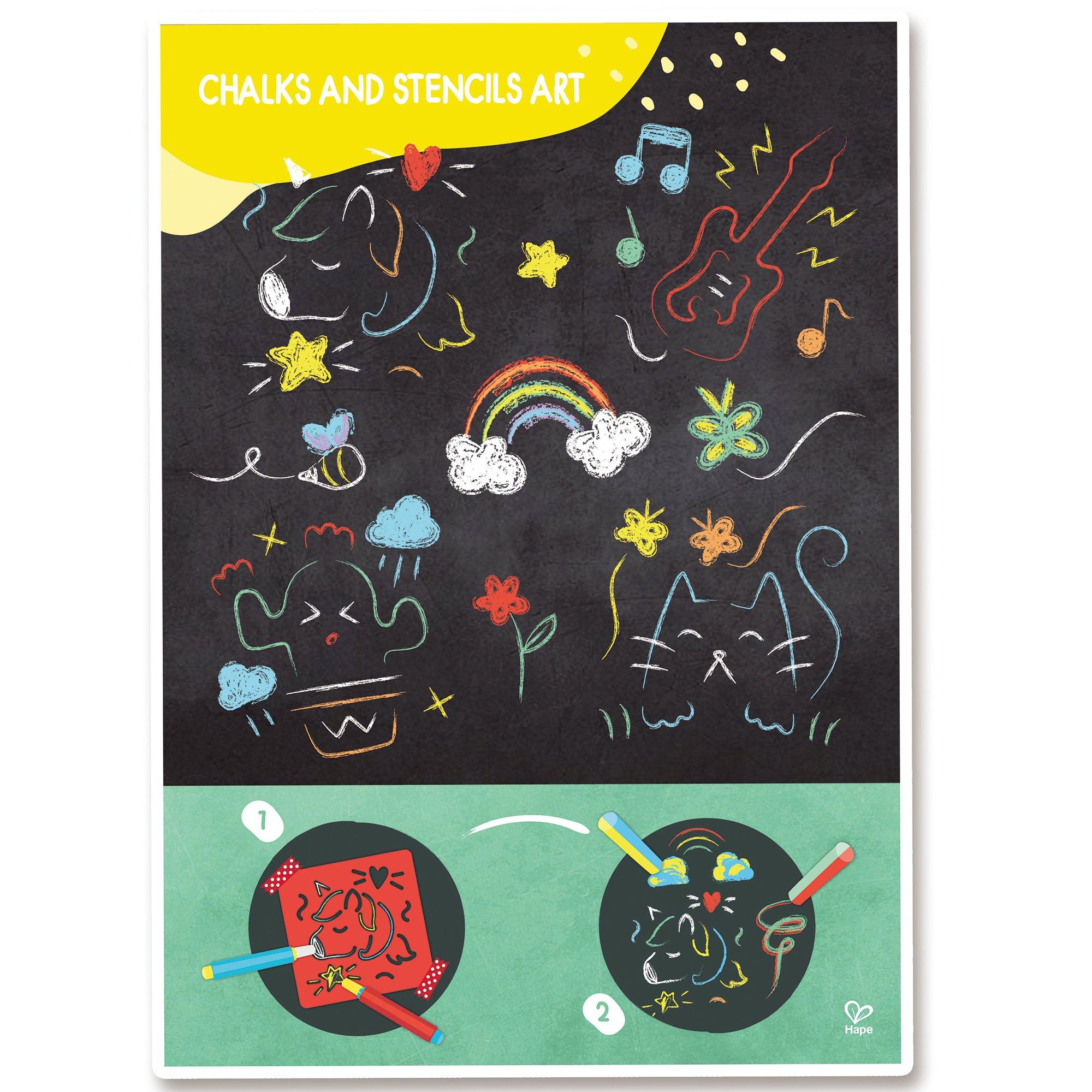 ENGAGING ART SET! Wonderful for teaching kids the basics of tracing and coloring so they can start creating their works of art. Chalk and stencil art set, perfect to use on Hape easels! A4 poster contains tips and suggestions.