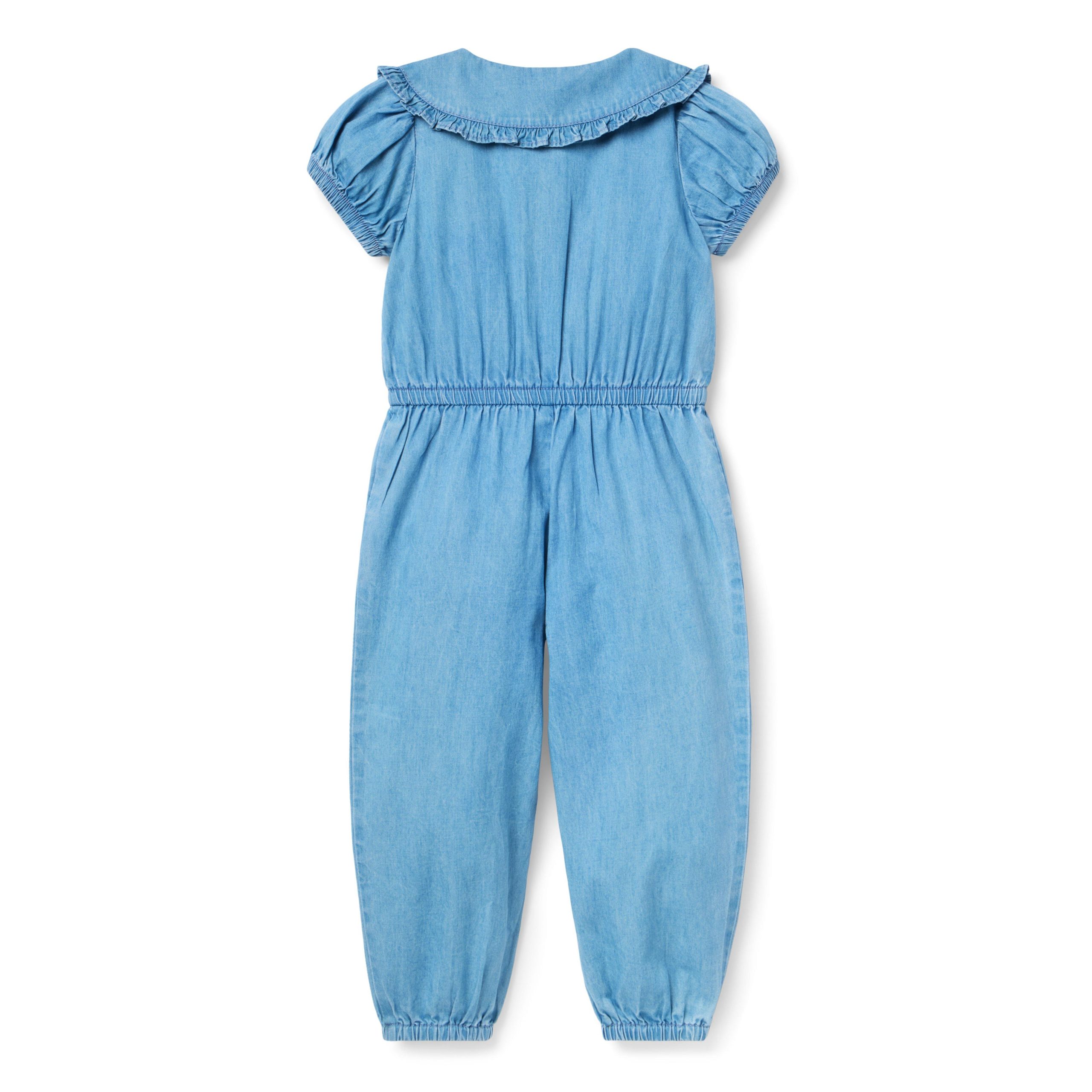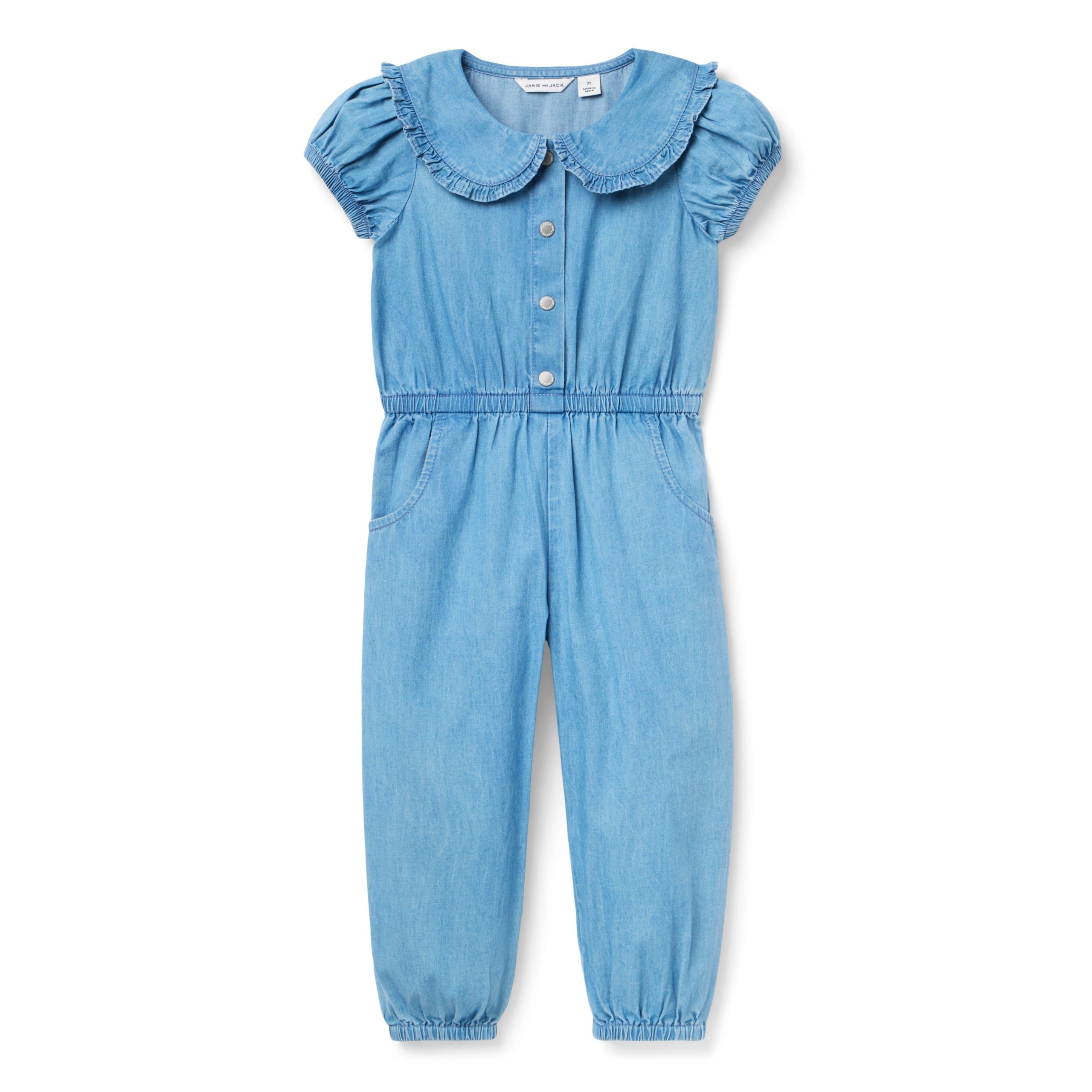 • An instant wardrobe favorite. Our chambray jumpsuit features a ruffle trimmed collar, puff sleeves and pockets for the little things.