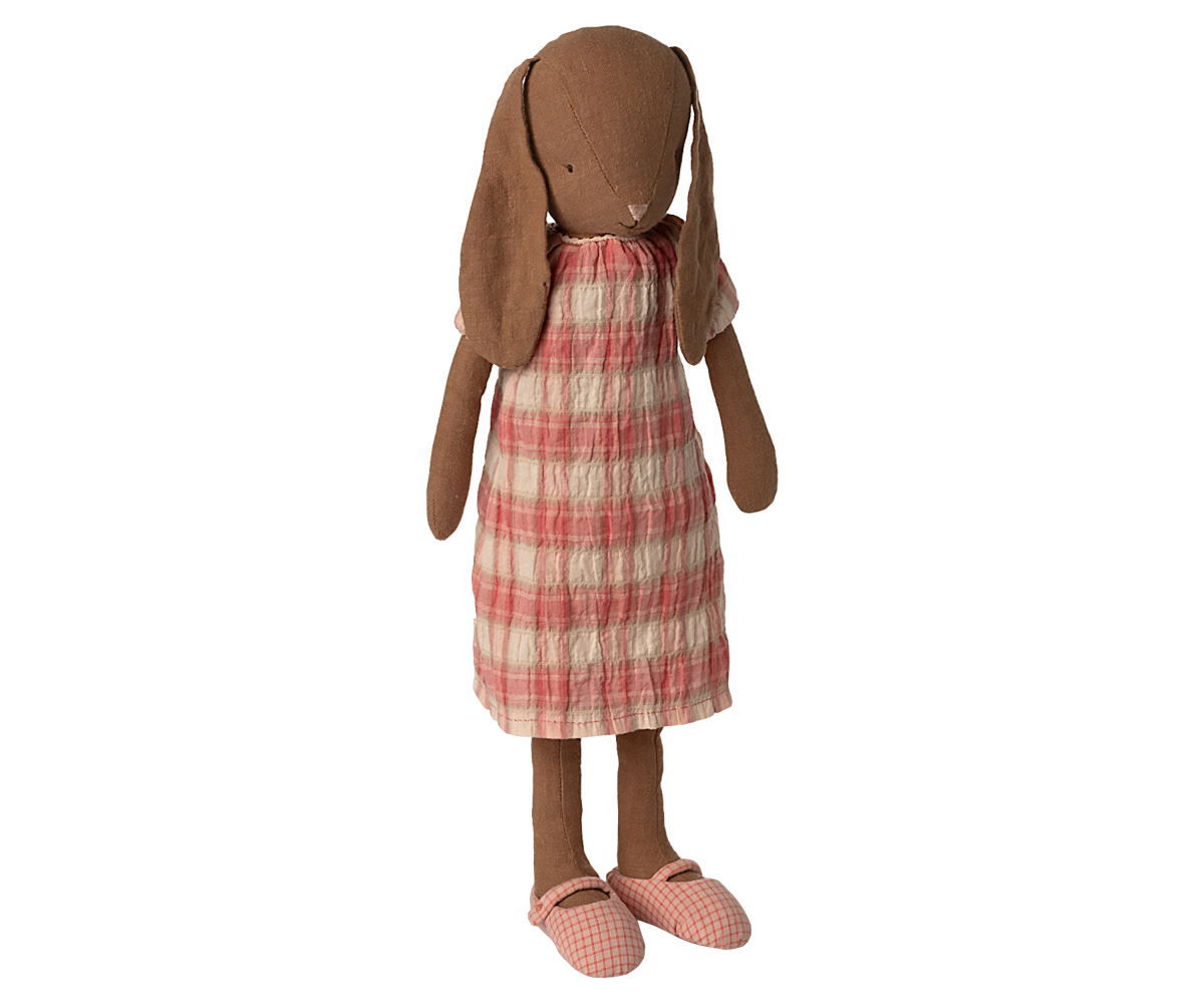 A classic bunny made of soft natural fabrics that gives a lovely hand feel and look. She is dressed up in a light summer dress and a soft shoe. Check out our clothes collection to expand the bunny’s wardrobe.