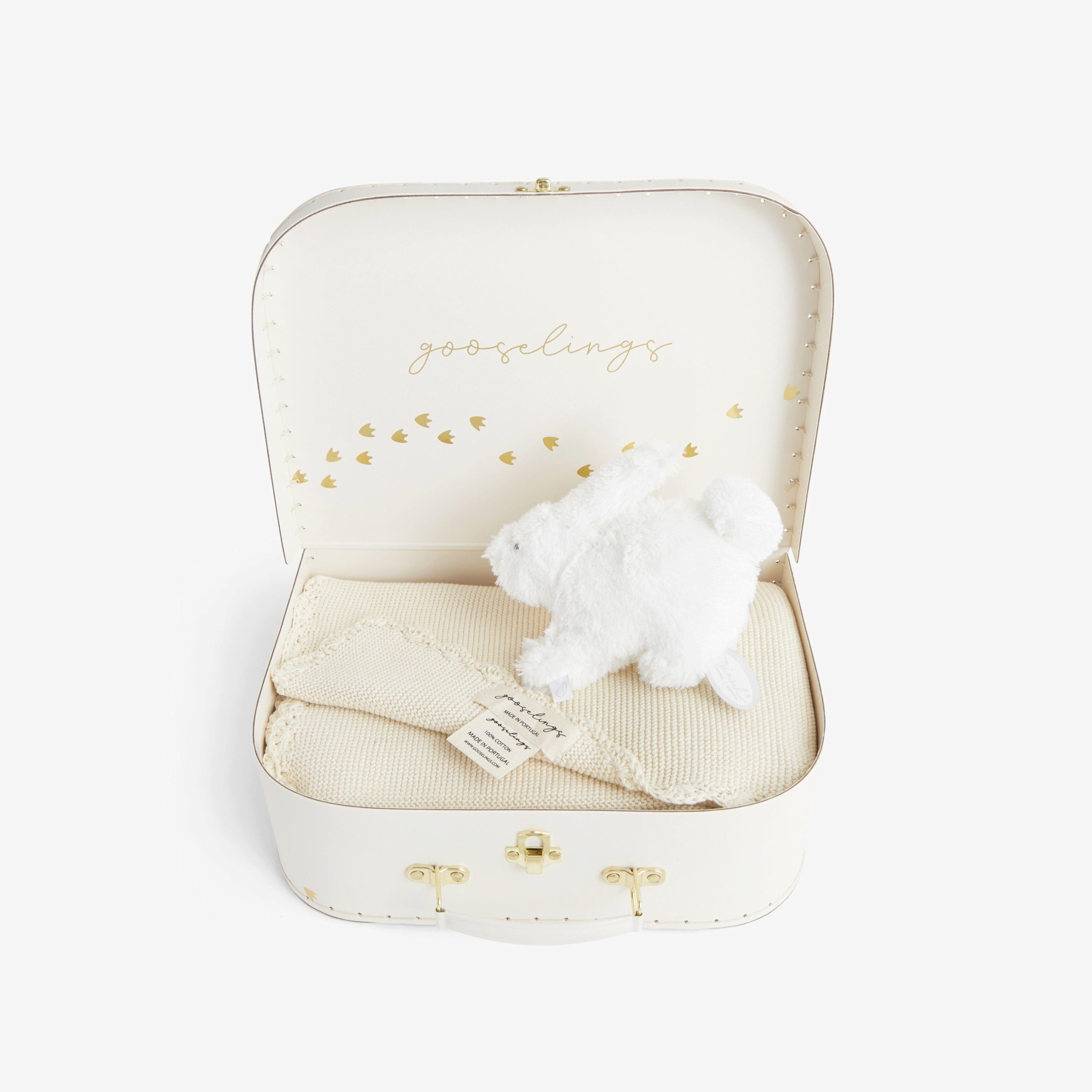• This Cozy Gift Box includes a beautifully crafted cotton knit blanket, a soft lovey, all elegantly packaged in a charming little suitcase perfect for storing toys and heirlooms.
