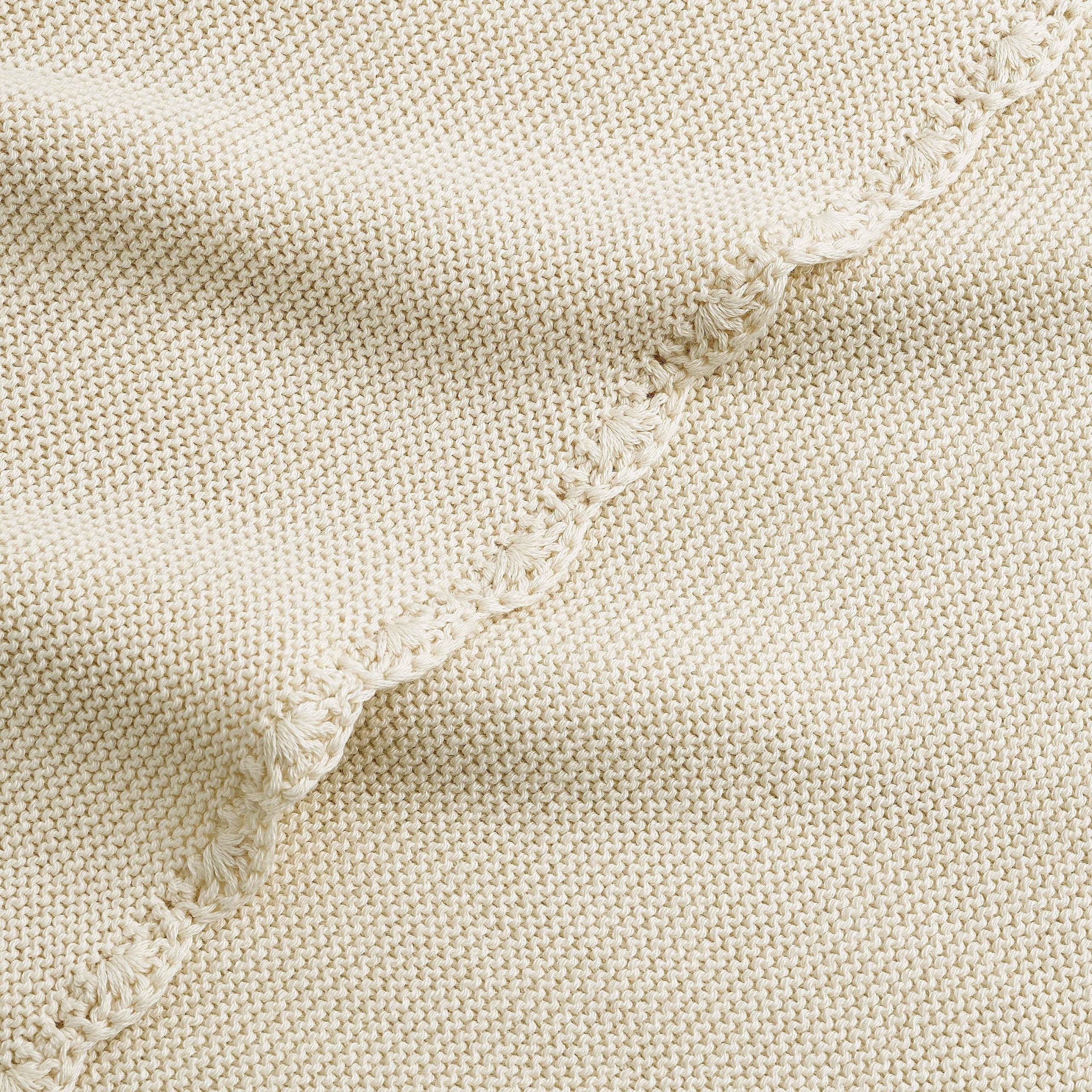 • Knit Blanket: 100% cotton with a hand-stitched scalloped pattern. Size: 30” x 40”.