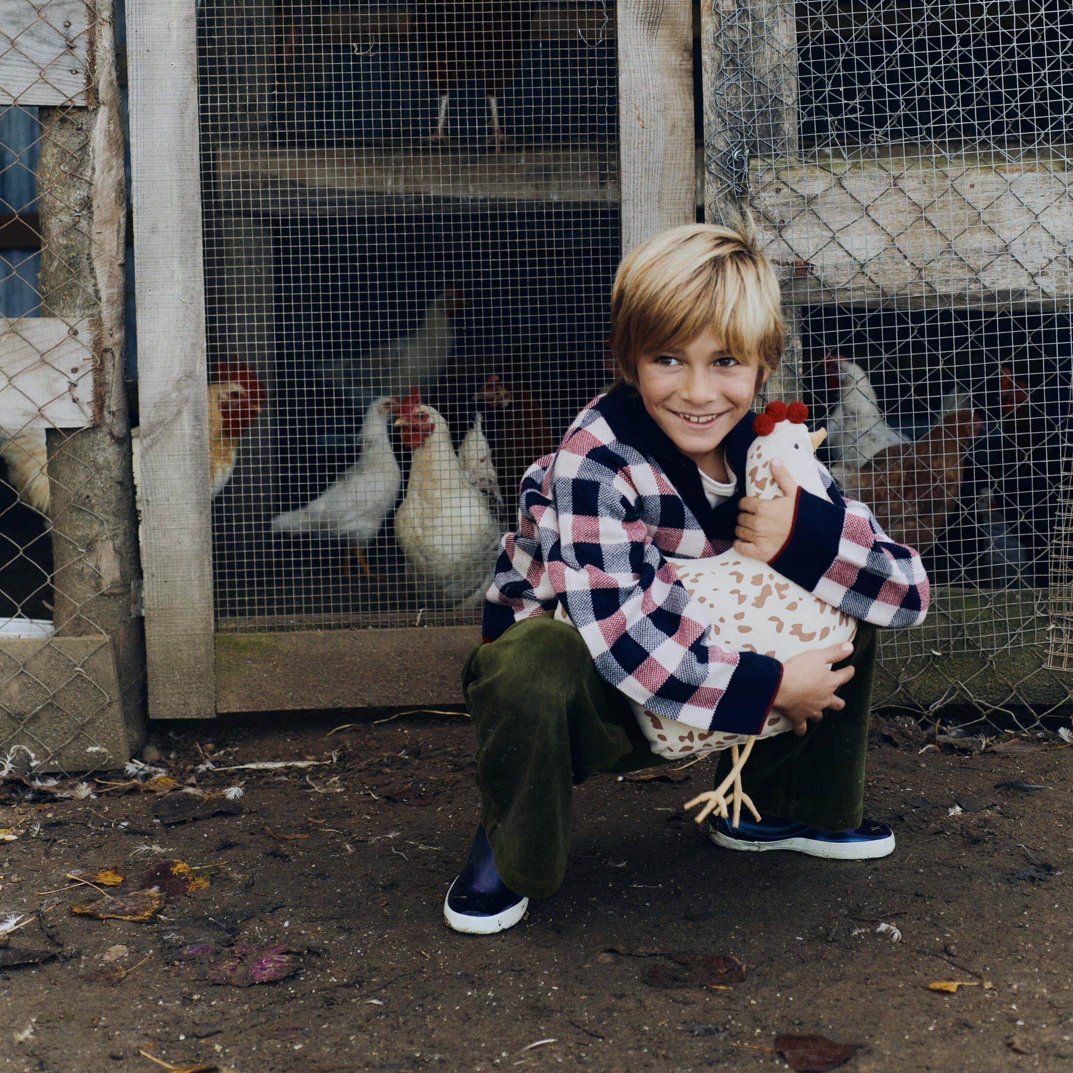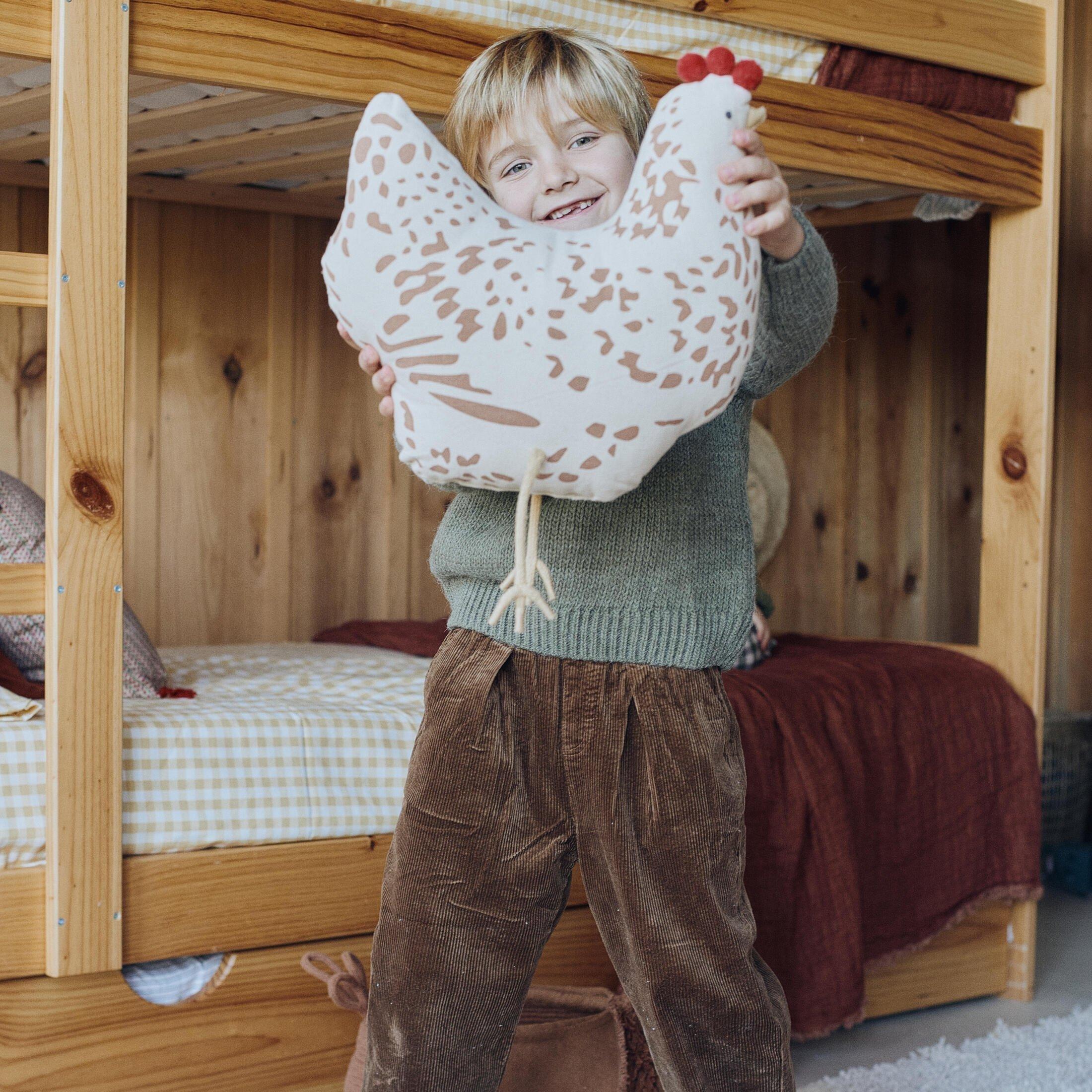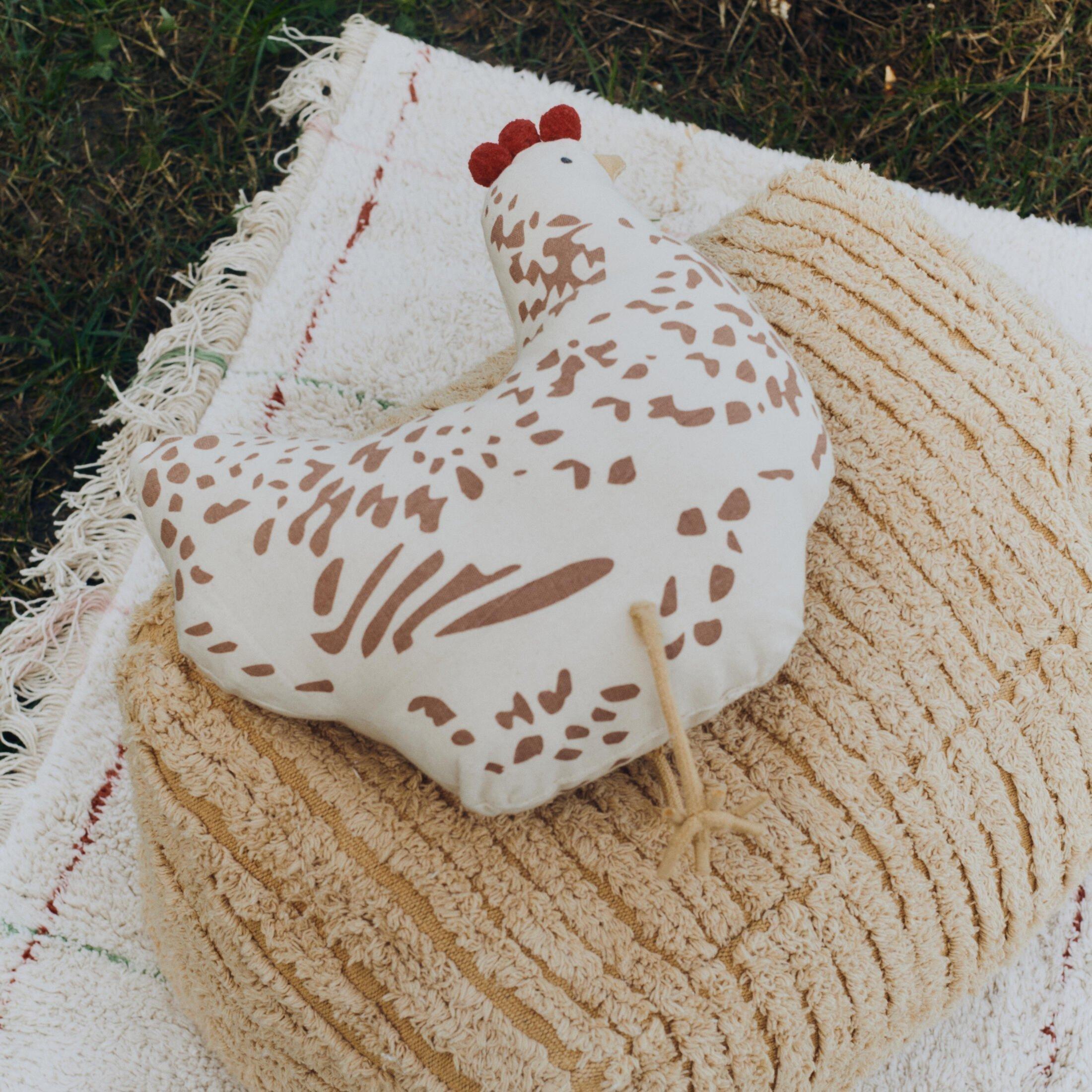 This cute chicken-shaped cushion is made from soft natural cotton,
