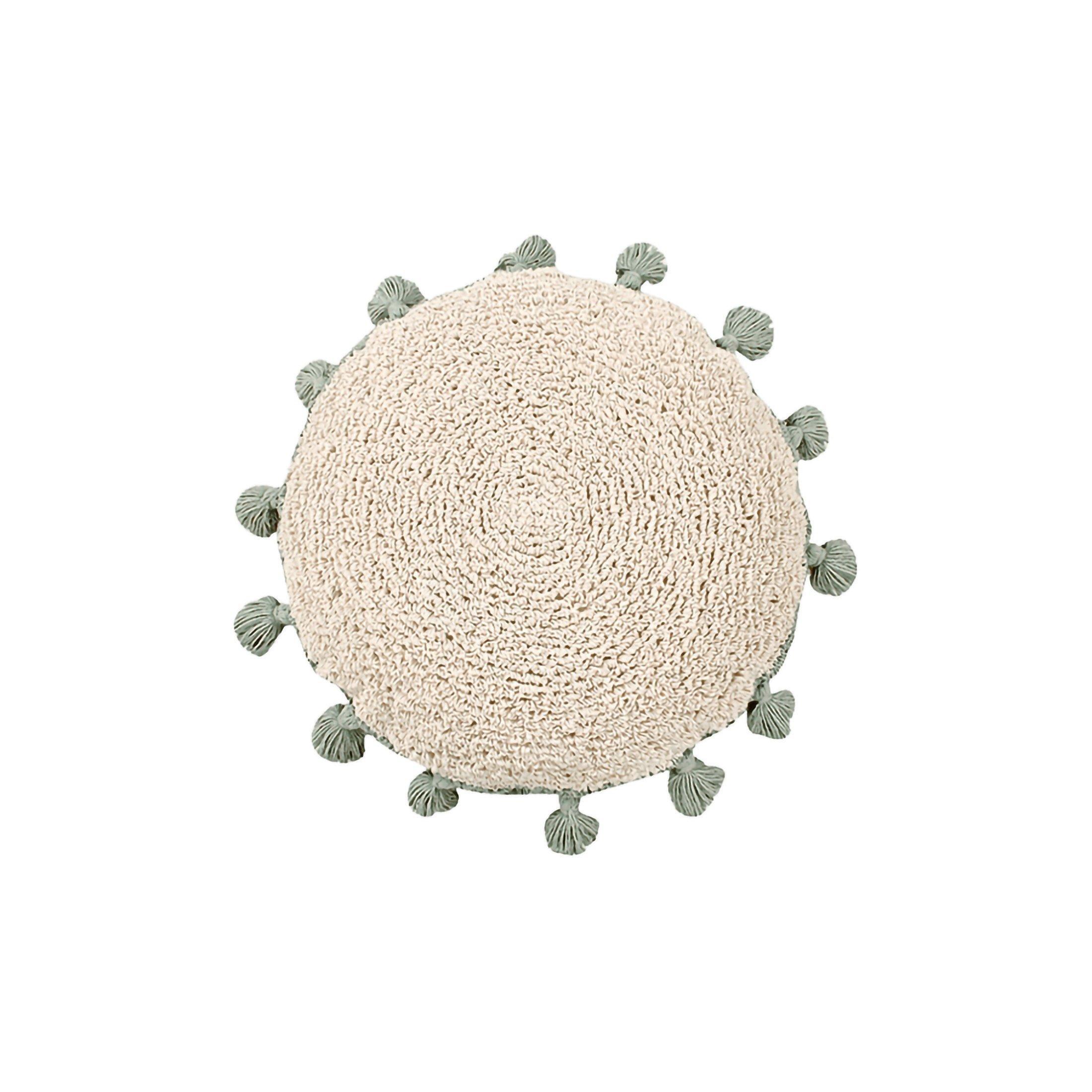 • Who doesn’t fancy a touch of chic boho style to finish off their decor? This filled washable round cushion with base in Natural colour using loop technique and medium green tassels all around, fits the purpose any time and on any surface, be it the sofa, the floor, the playroom, the garden, or a reading nook. When the chill-out mood strikes, be sure to have one near you!
