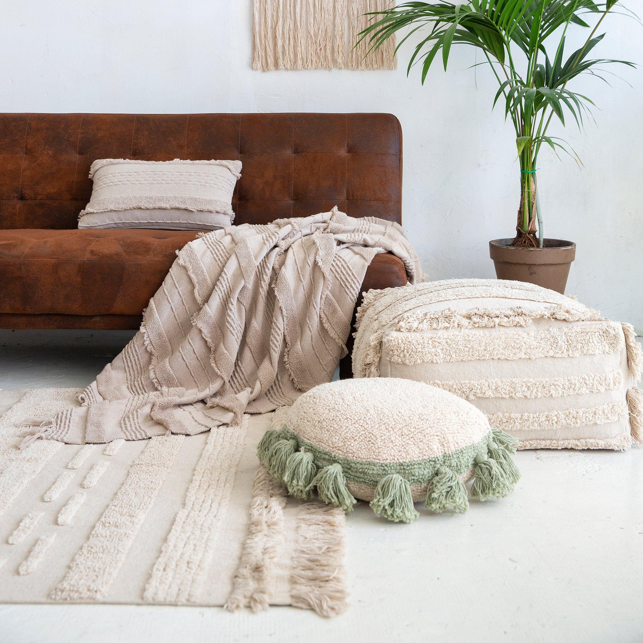 • Comfort: Make your space comfortable and cozy with our soft decor essentials. From cushions to poufs and rugs, each piece is handcrafted from natural materials like cotton and wool, ensuring both comfort and sustainability.