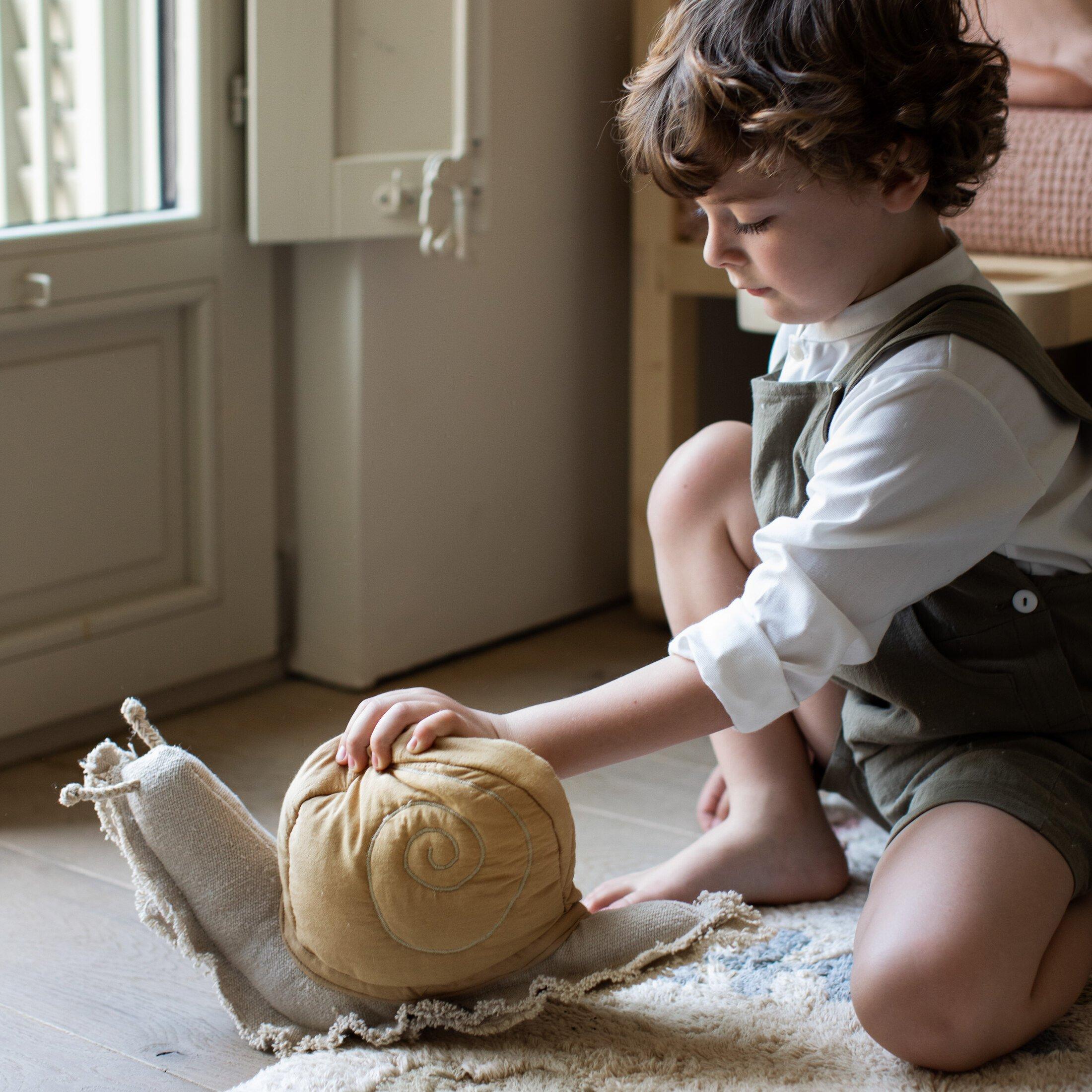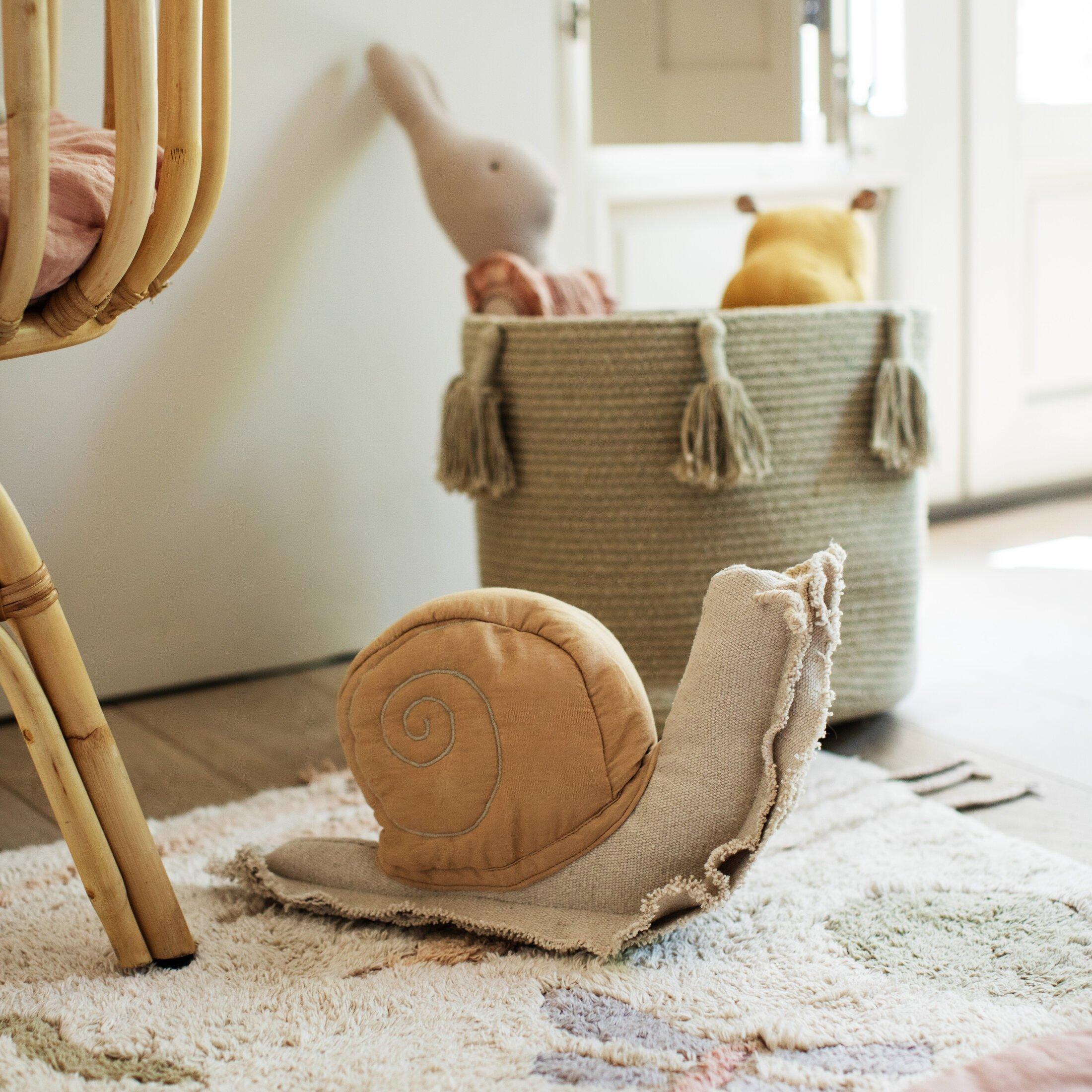 • Our Lazy Snail cushion will be your little ones’ favorite! The shaped cushion has a body in natural cotton canvas with cut-edge finish and handmade braids as antennas. The Honey colored shell is made of a soft GOTS certified organic cotton, with a pattern of embroidered stitches.