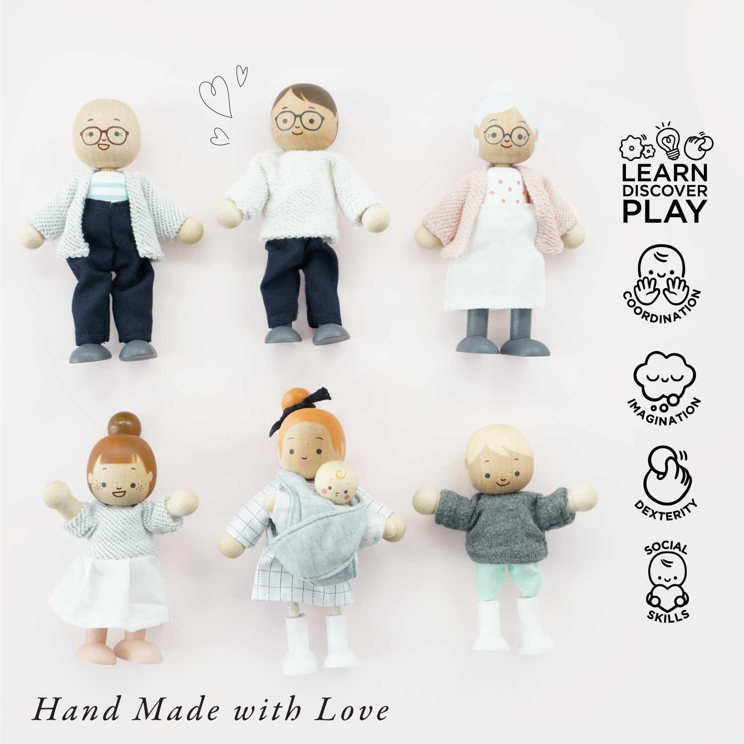 This lovely little doll family are ready to move into their brand new dream home. Comprising 7 highly detailed figures, poseable characters, this set comprises parents, grandparents, children and baby complete with baby carrier.