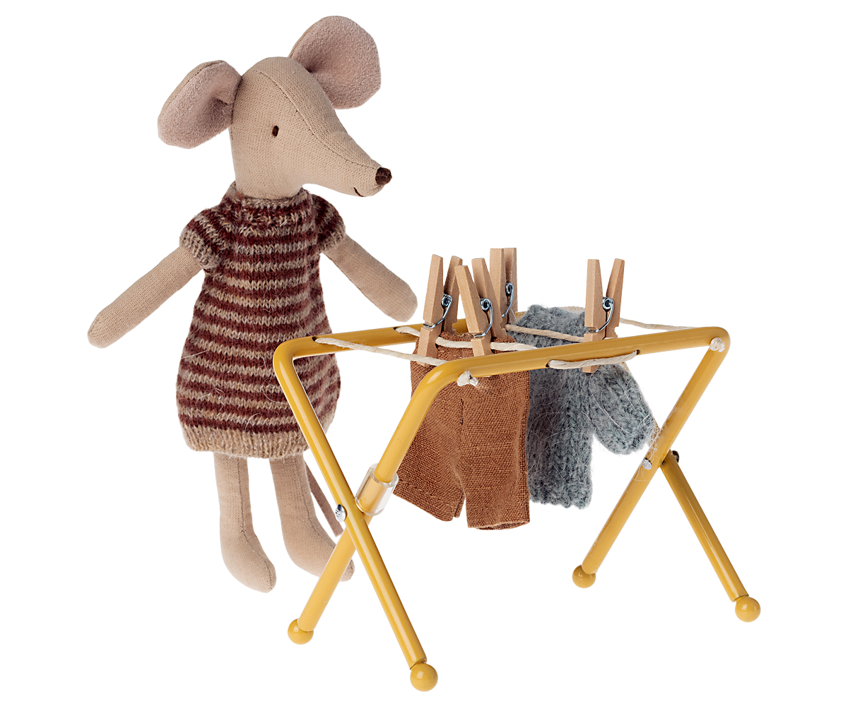 All families have a lot of laundry. This drying rack is made for the mouse family and fits their small-sized clothes. This set includes a drying rack and small wooden pegs.
