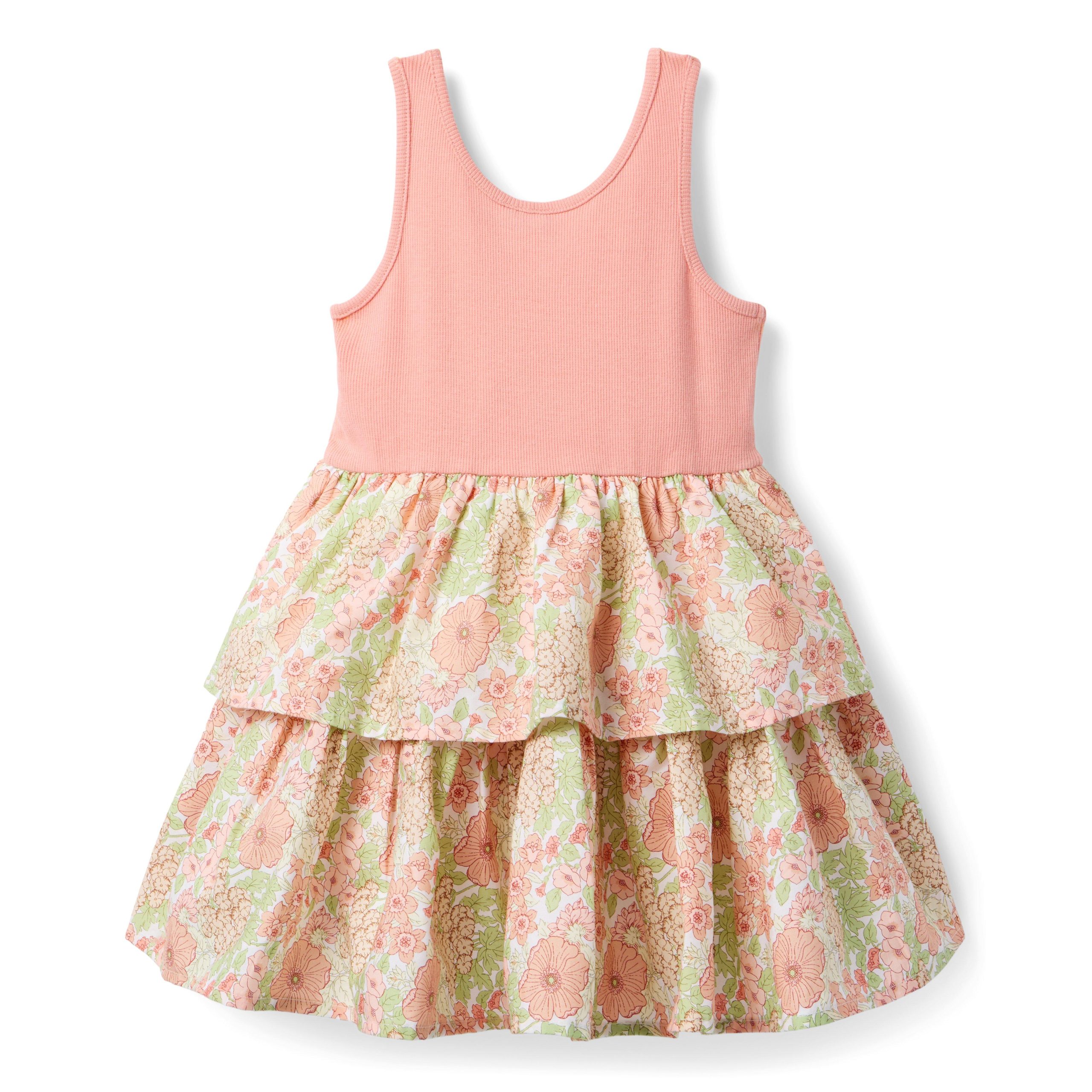 • Florals and ruffles? Yes and yes. Take them for a spin with this sunshine-ready dress, featuring a ribbed bodice and tiered skirt.