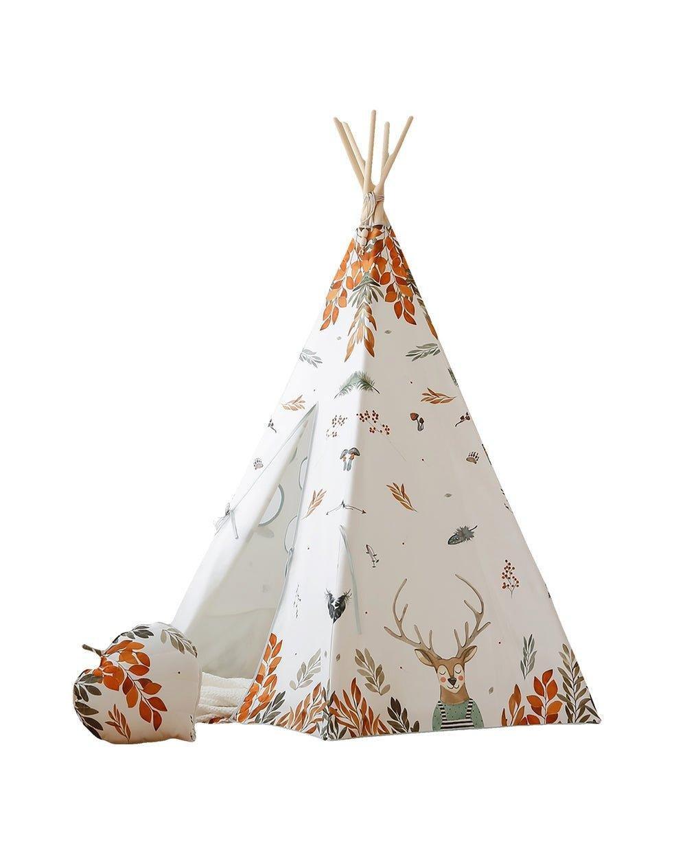 Your little adventurer may spend long hours exploring the world and playing, but upon return he or she needs a place to rest, eat, and make plans for further adventures. A teepee literally means a dwelling, and is a word used by the Sioux, the indigenous people of the Great Plains. It is a space for all kinds of fun. When the play is finished, you can pack the teepee back in the cover and put it away, for example, in the corner of the room. It does not take much space when folded, and the cover enables you to easily take it outdoors. There is a pocket inside where children can hide their toys, books and other treasures. The white background of the teepee fits any interior! PART OF THE FOREST FRIENDS COLLECTION It is part of our autumn collection, born out of love for hiking in the forest and sleeping in a tent in the wild. Designed in collaboration with illustrator Iwa Kowalska, the teepee fits perfectly into the autumn mood and introduces a unique atmosphere in the room. The “Forest Friends” teepee stands out not only because of its beautiful colours, but also because of its original author’s pattern on the fabric. The fabulous watercolour pattern was created for us by Iwa Kowalska. It was born out of love for hiking in the forest and spending nights in a tent in the wild! Made of natural materials: 1% cotton fabric and pine poles. Thanks to its five-wall structure, the tent is stable when it is put up, the poles are rounded and placed in tunnels sewn together at the bottom. The teepee is perfect to use at home, in the garden or at the beach. The set includes a play tent, poles and a cotton cover. Feel free to complement it with our beautiful decorations and accessories. Fabric: 1% OEKO-TEX® certified cotton. Fabric weight: 7.67 Washing temperature: up to 86°F. Pine poles: 7.9 in. Height when put up: 66.9 in.Perfect for epic outdoor adventures or rainy-day indoor playdates, our adorable teepee tents give kids a peaceful place to hide out and let their imaginations run wild.