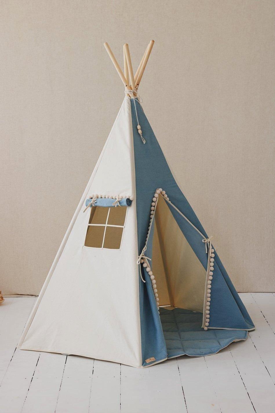 Your little adventurer may spend long hours exploring the world and playing, but upon return he or she needs a place to rest, eat, and make plans for further adventures. A teepee literally means a dwelling, and is a word used by the Sioux, the indigenous people of the Great Plains. It is a space for all kinds of fun. And it has a window with a curtain to watch the surrounding area! When the play is finished, you can pack the teepee back in the cover and put it away, for example, in the corner of the room. It does not take much space when folded, and the cover enables you to easily take it outdoors. There is a pocket inside where children can hide their toys, books and other treasures. The “Jeans” teepee with pompoms is a classic tent, often chosen for boys. Made of strong cotton and denim fabric, it is decorated with large pompoms. Made of natural materials: 1% cotton fabric and pine poles. Thanks to its five-wall structure, the tent is stable when it is put up, the poles are rounded and placed in tunnels sewn together at the bottom. The teepee is perfect to use at home, in the garden or at the beach. The set includes a play tent, poles and a cotton cover. Feel free to complement it with our beautiful decorations and accessories. Fabric: 1% OEKO-TEX® certified cotton. Fabric weight: 7.67 Washing temperature: up to 86°F. Pine poles: 7.9 in. Height when put up: 66.9 in. Base diameter: 47/52 in.Fabric: 1% OEKO-TEX® certified cotton. Fabric weight: 7.67Washing temperature: up to 86°F.Pine poles: 7.9 in.Height when put up: 66.9 in.Base diameter: 47/52 in.