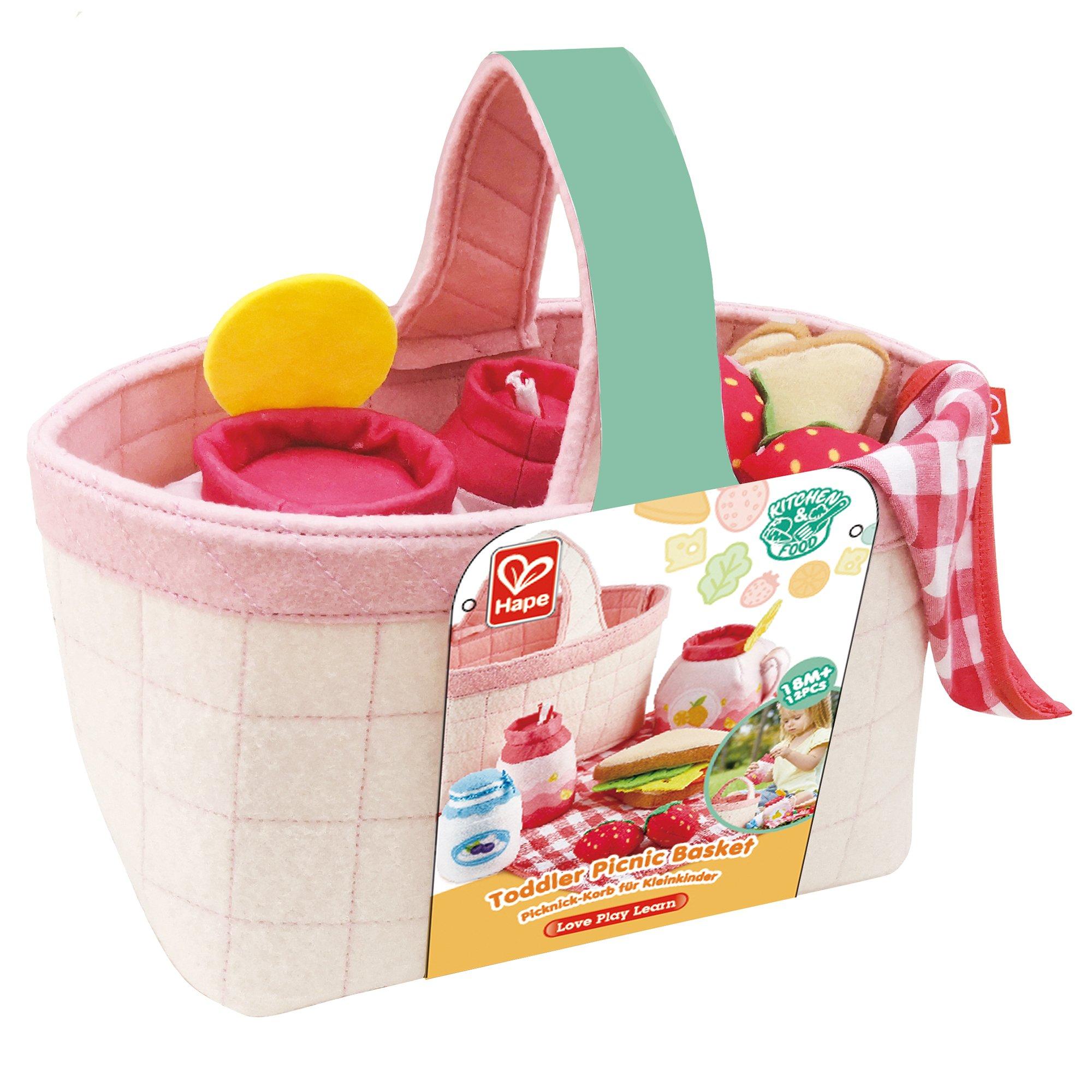12-PIECE SOFT PICNIC PLAY SET: Includes one fabric basket, one picnic cloth, three bottles of beverages, two strawberries, two pieces of bread, one lettuce leaf, tomato, and cheese to make a sandwich with!